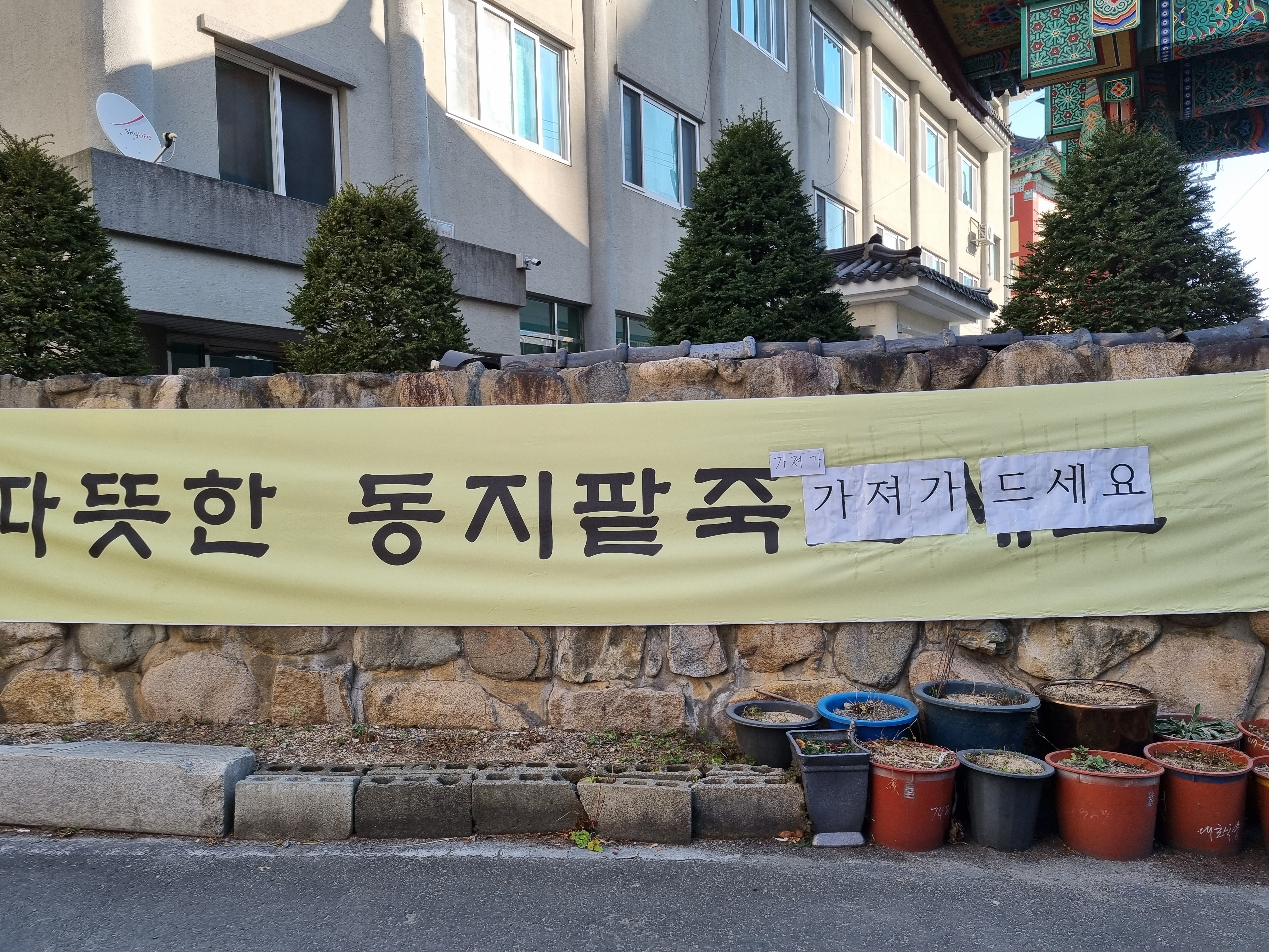 요런게 붙어 있는거예요 ㅎ 완전 반가웠어요? 혹시나..쭈뼛쭈뼛 입구에 들어가보니 팥죽 여러통을 만들어서 가져가라고 봉지에 넣어두고 계시더라구요~