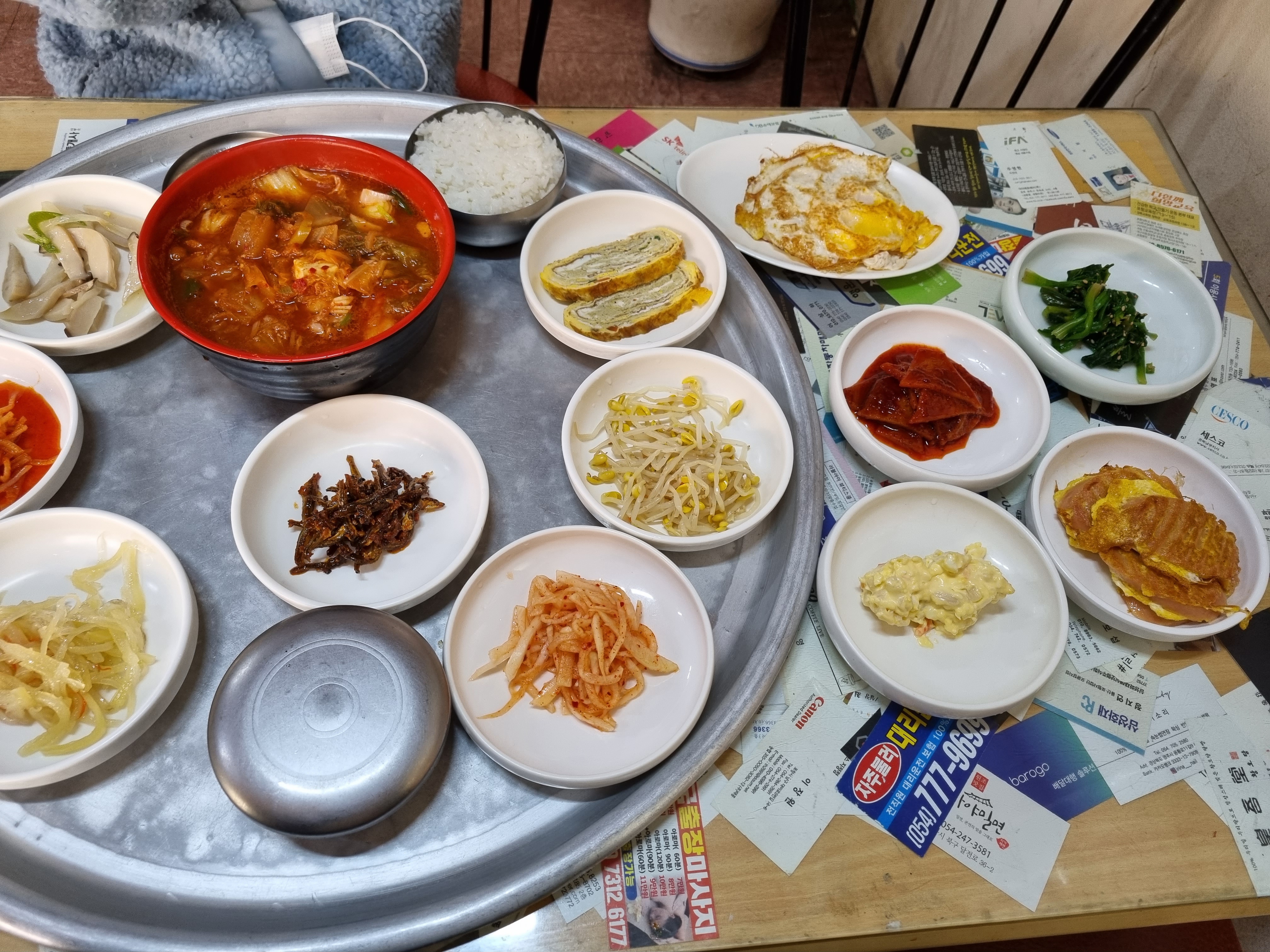 김치찌개 2개 시켰는데, 이렇게 반찬 가득입니다