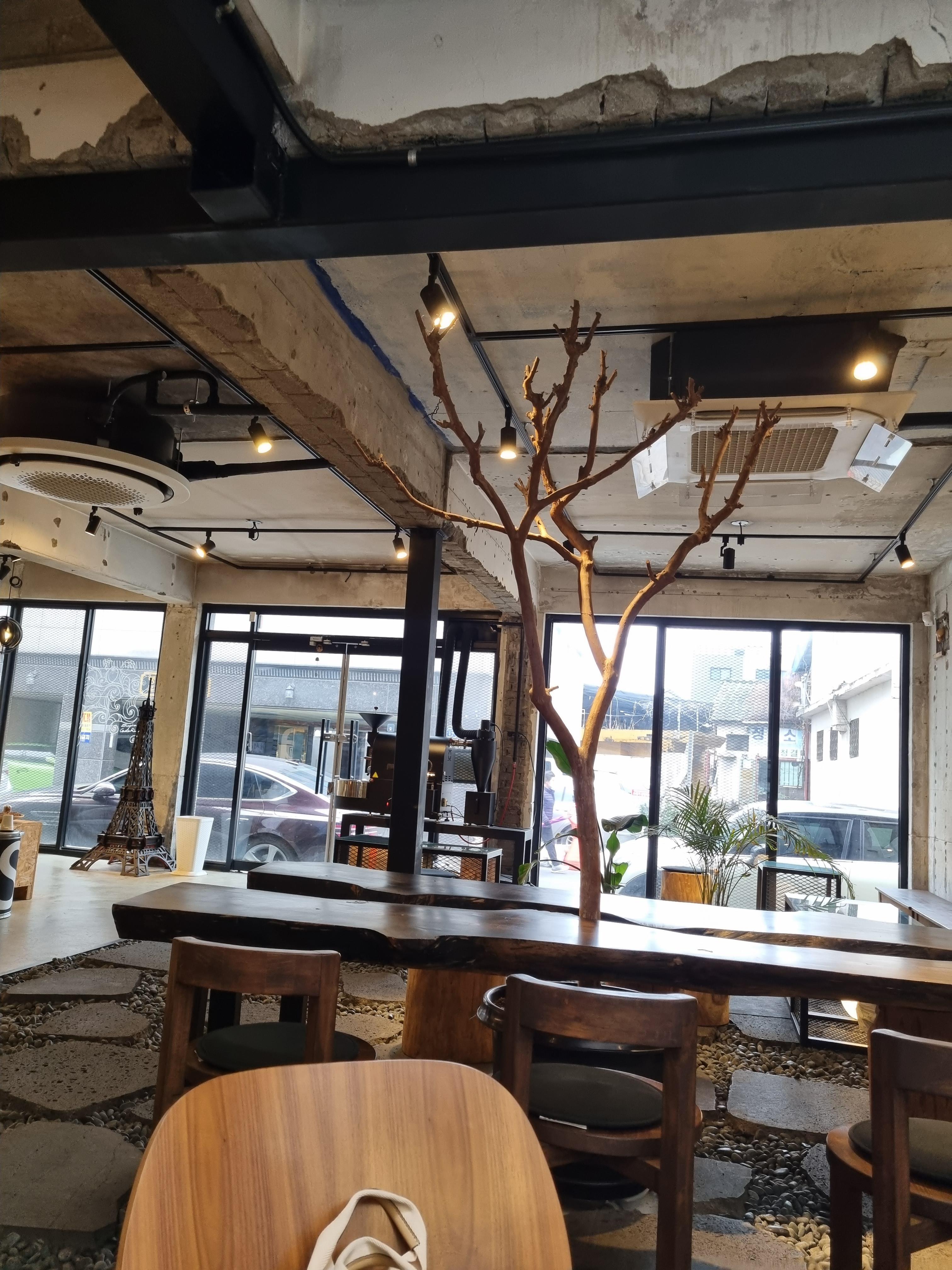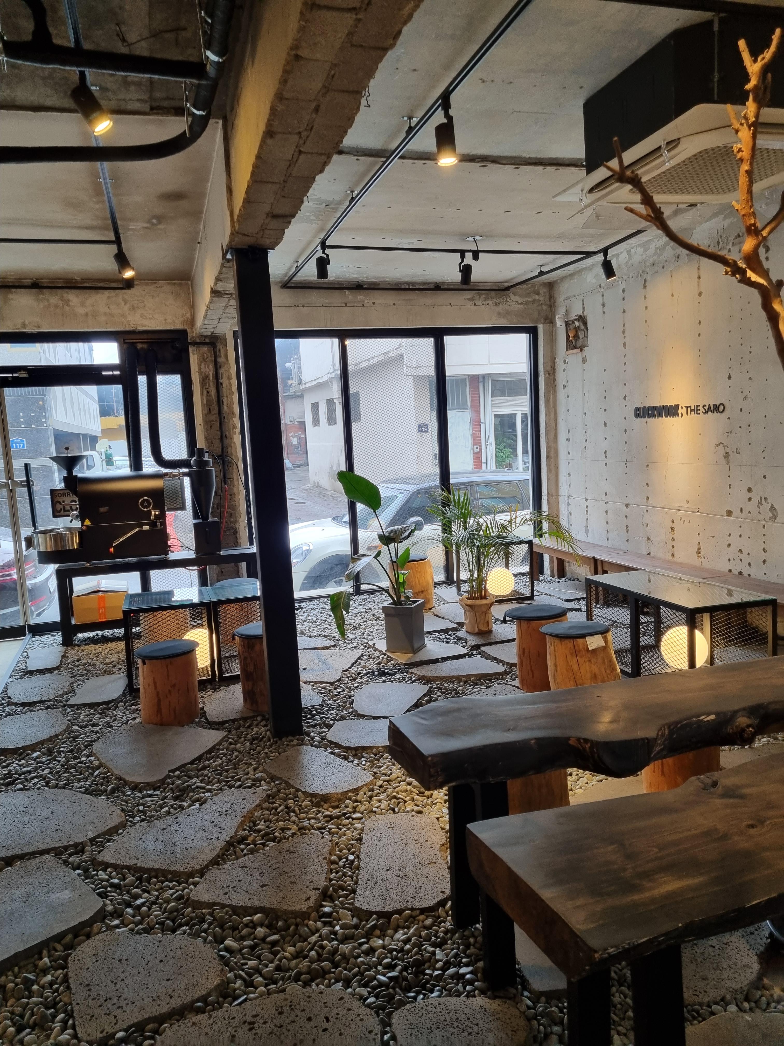 커피 로스팅 기계도 보이구요. 자갈이 까려있고 조명도 따뜻해서 분위기가 너무 좋아요~