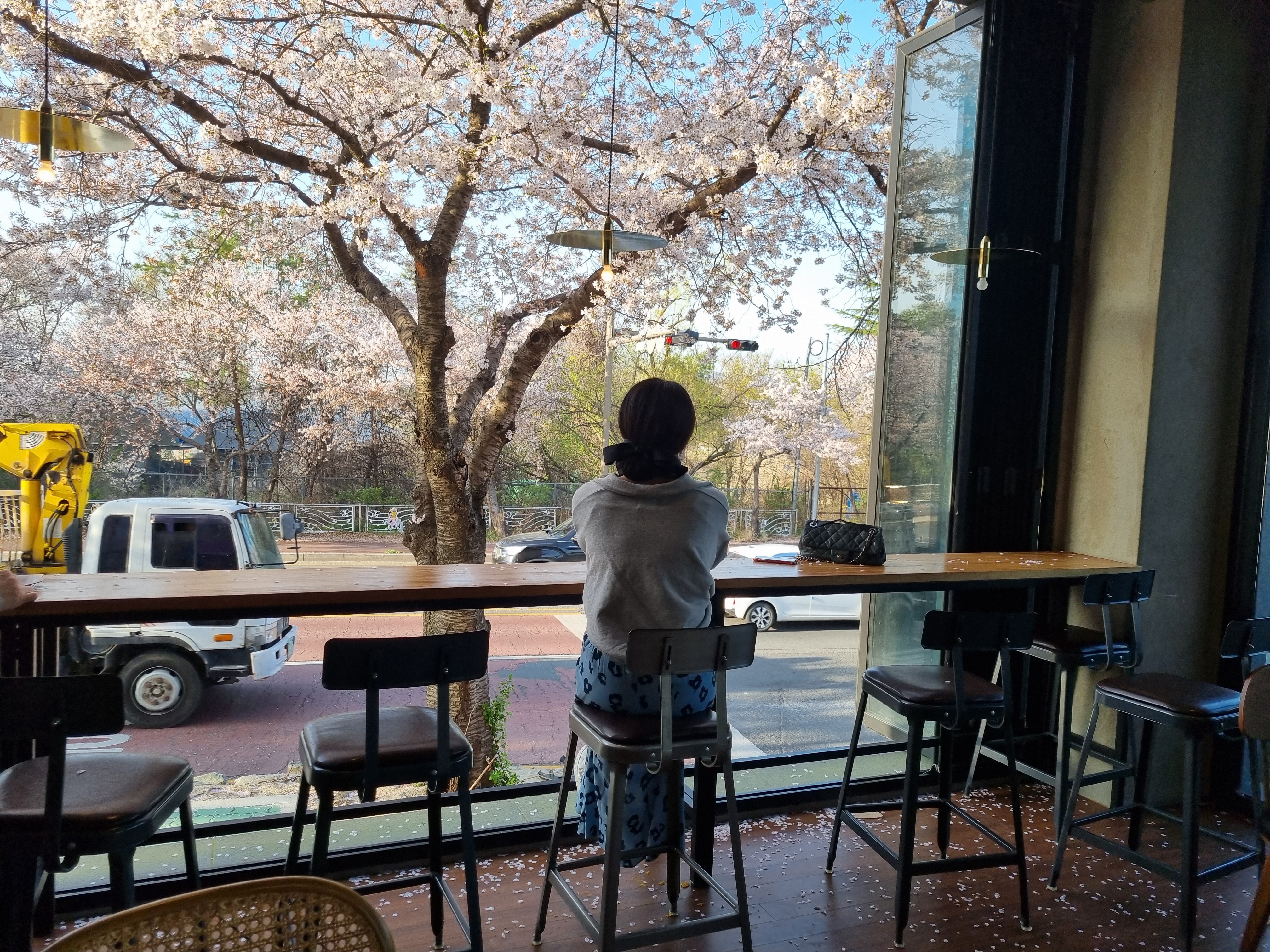 1층에 들어서면 창이 오픈되어서 멋진 벚꽃 풍경을 바로 볼 수 있어요