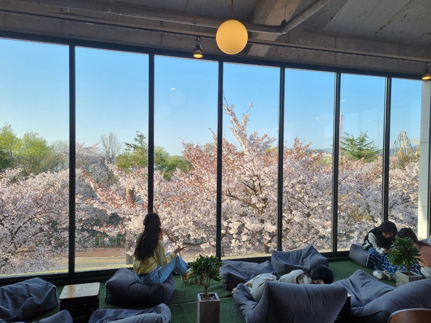 빈백에 누워서 벚꽃 풍경을 2층에서 보며 마시는 커피란. 두 말이 필요없죠