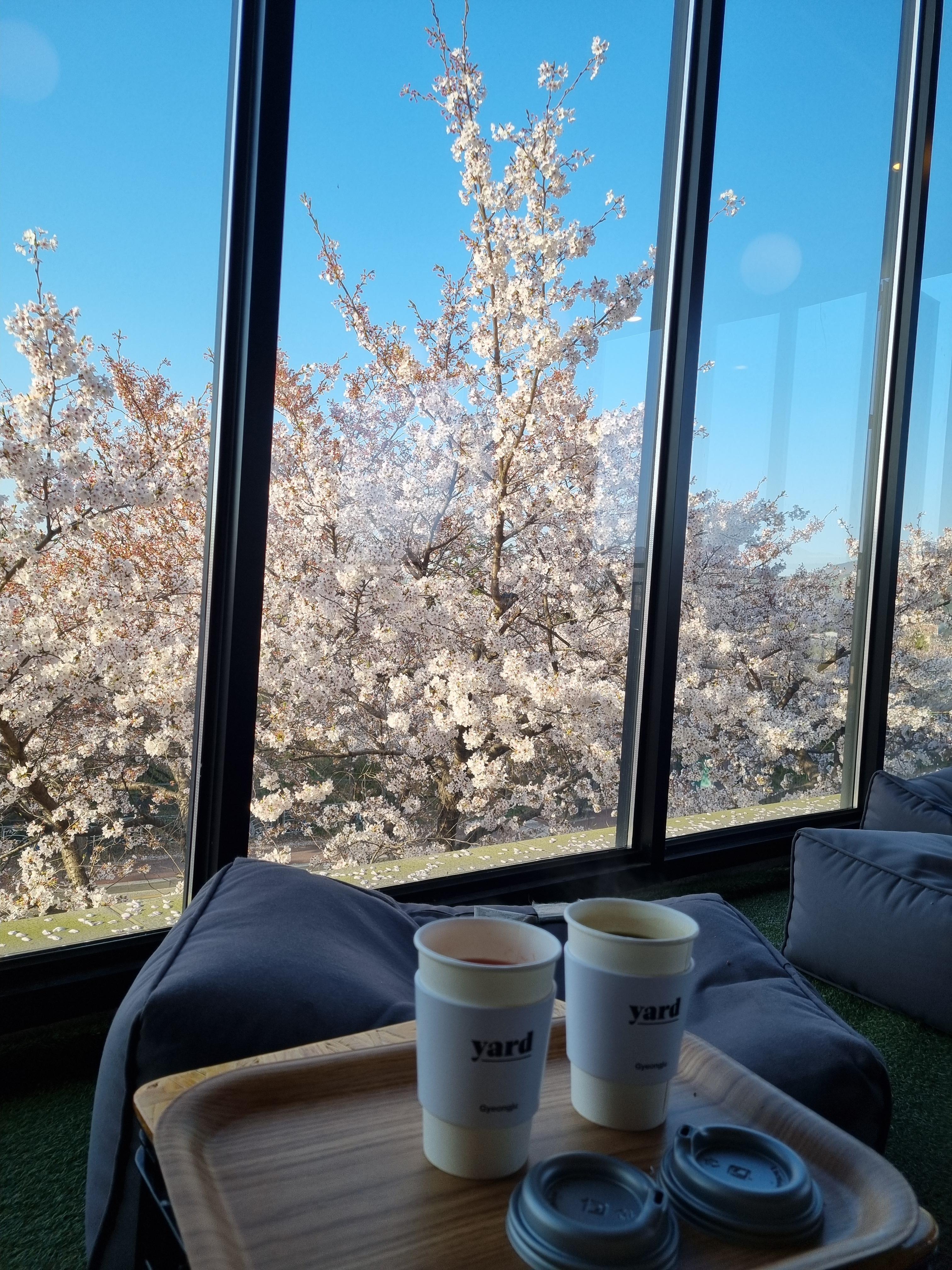 빈백에 누워서 벚꽃 풍경을 2층에서 보며 마시는 커피란. 두 말이 필요없죠