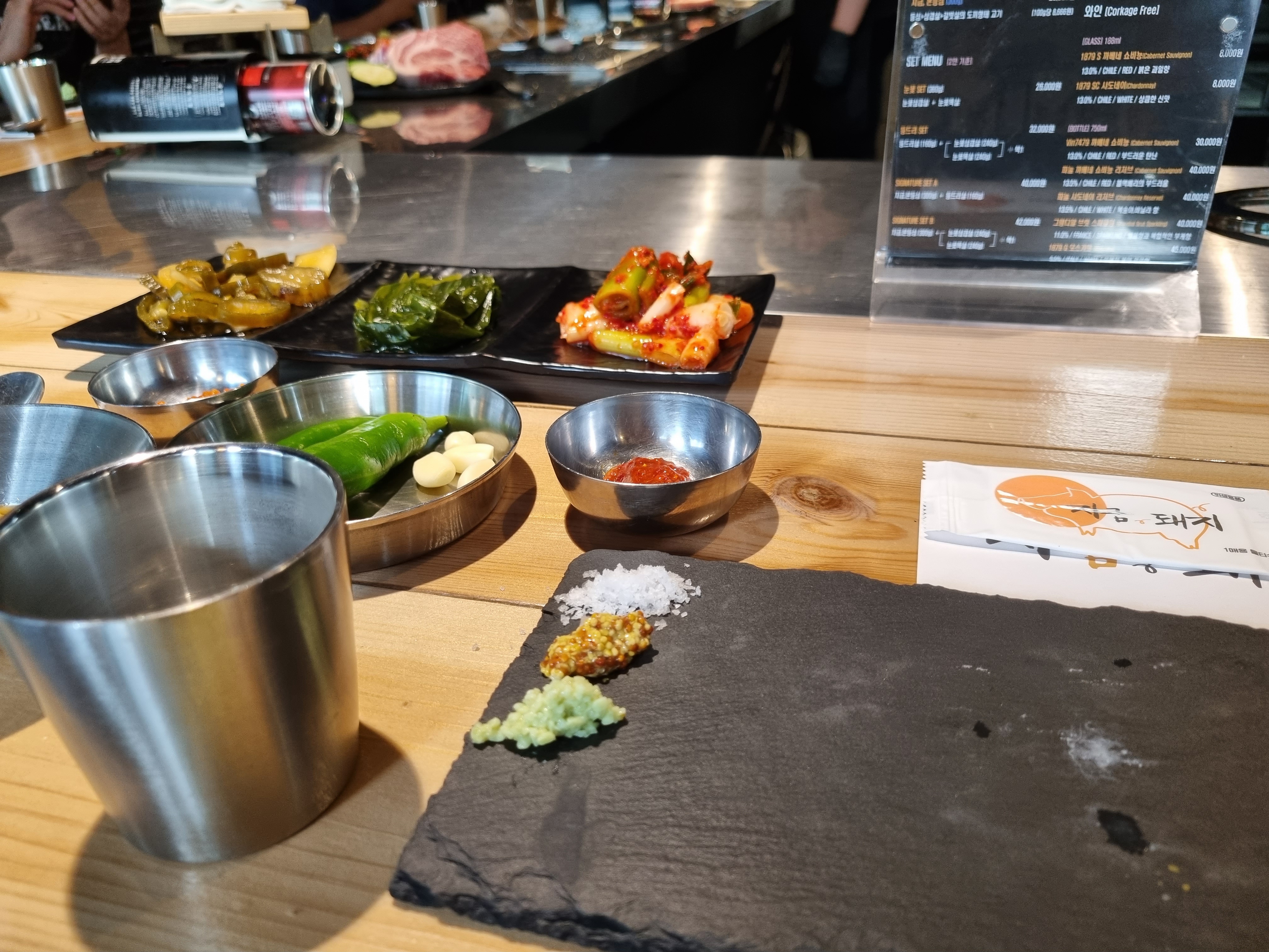 소금..씨겨자..와사비는 먹운만큼 덜어서 접시 한켠에 준비해두고 맛있게 고기가 구워지길 기다렸죠