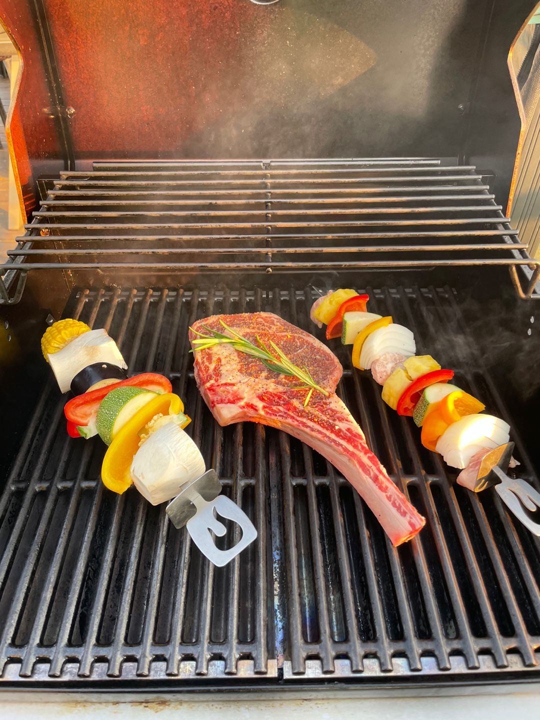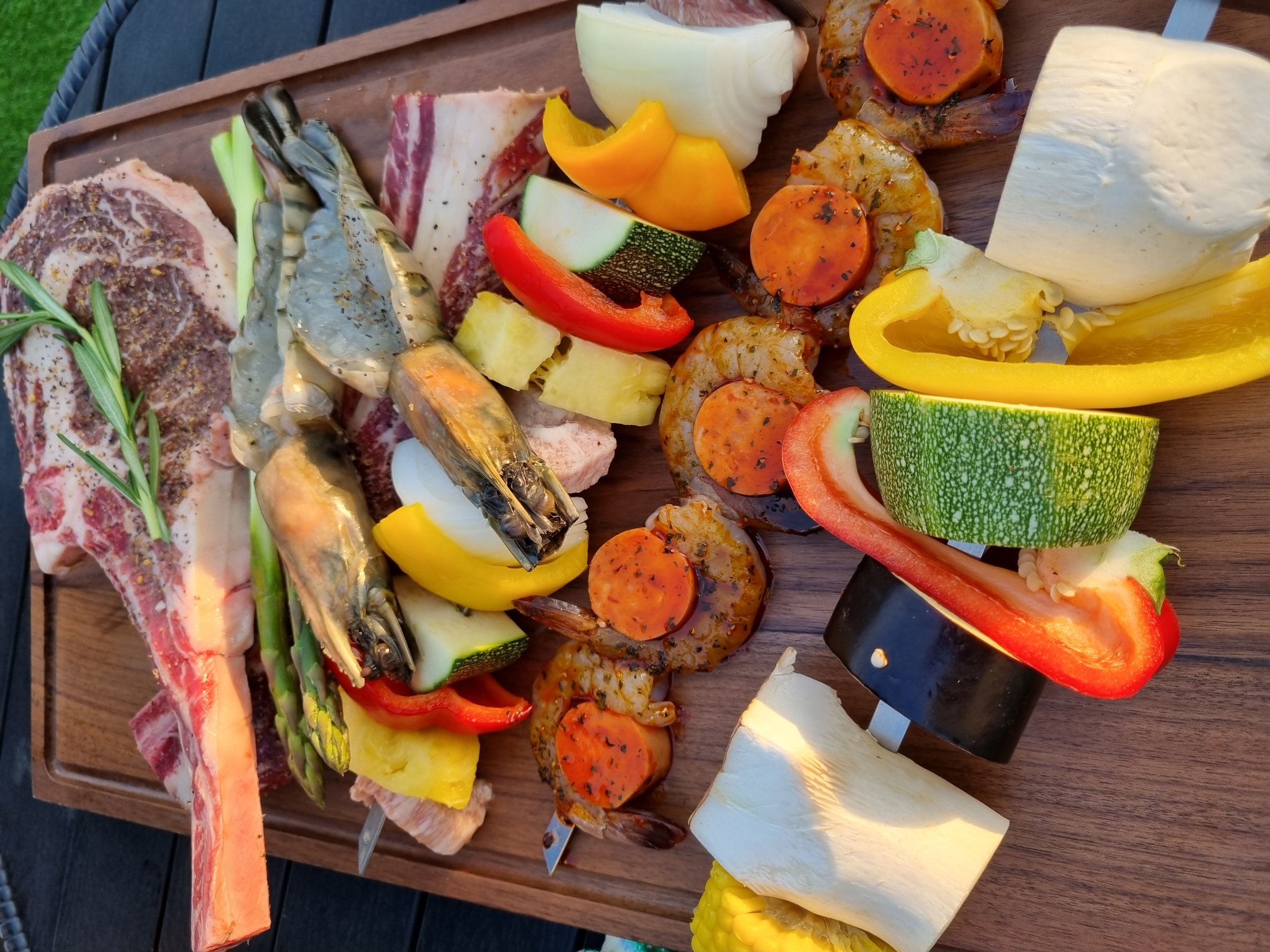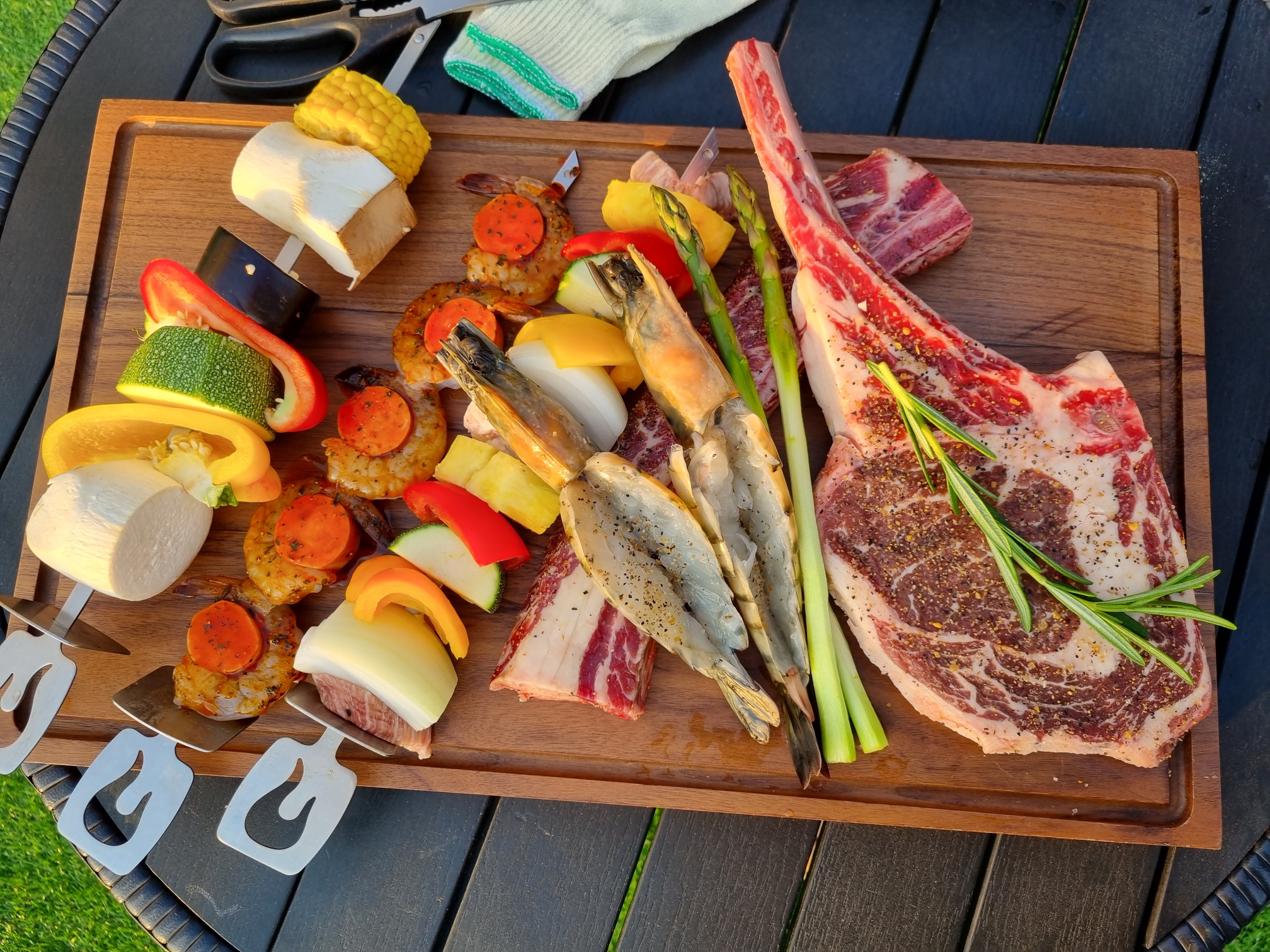 토마호크, 우대갈비, 채소꼬치와, 새우 소세지꼬치 그리고 왕새우 두 마리네요^^
