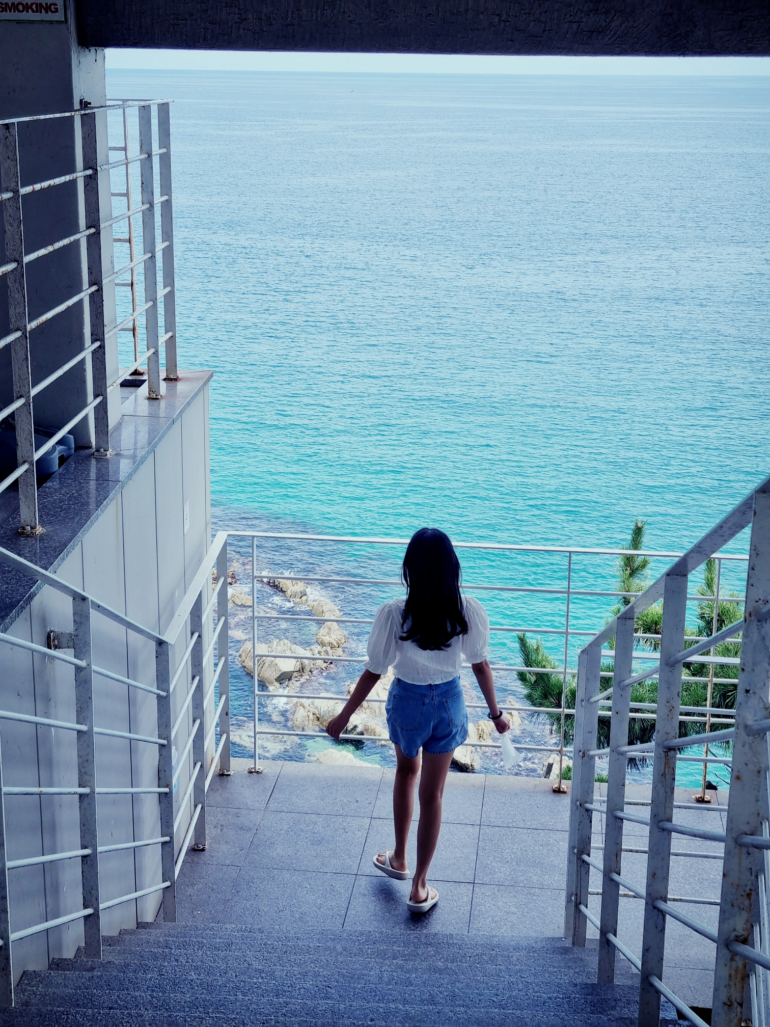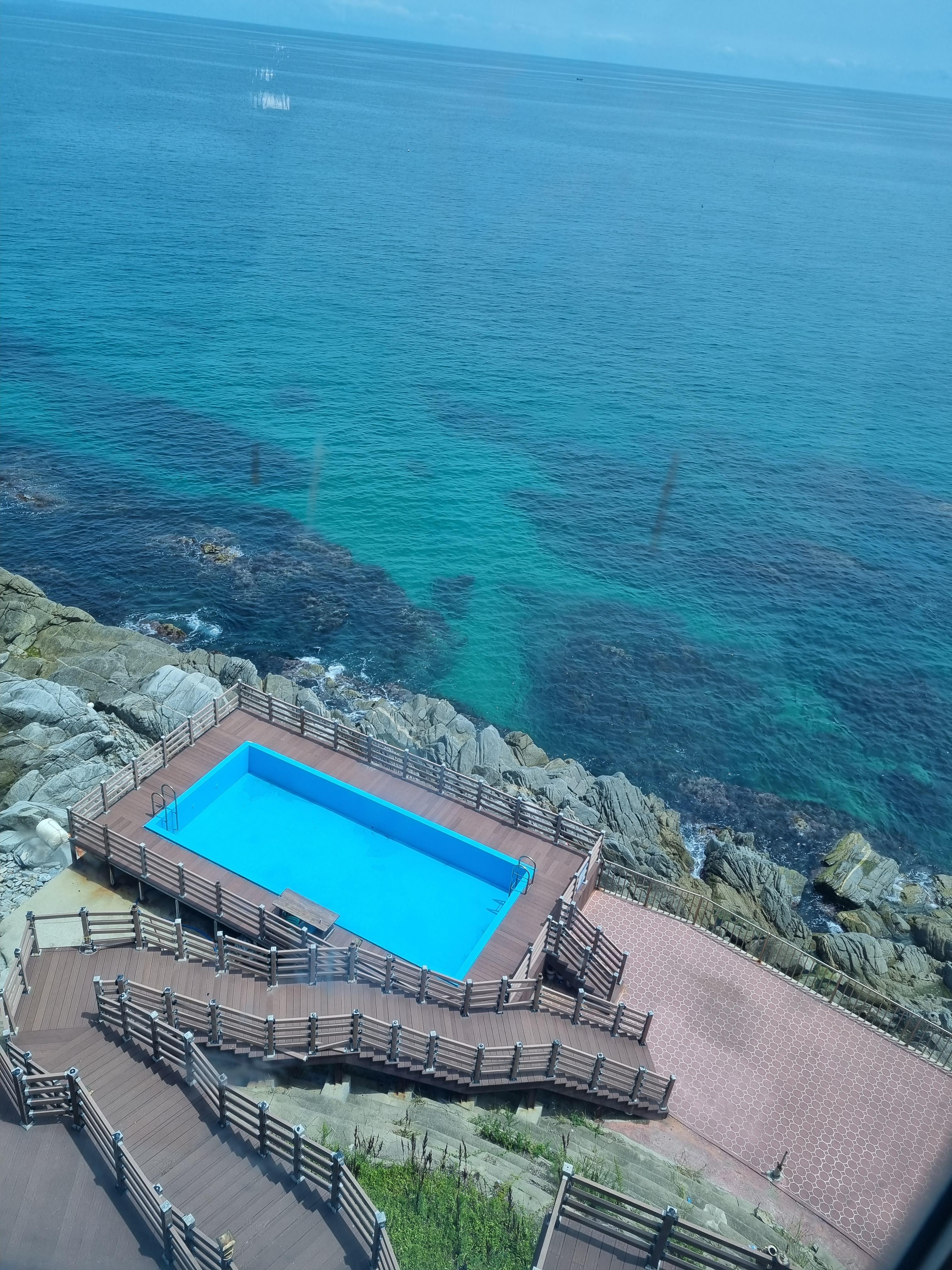 식당에서 화장실지나서 데크를 따라 걸을 수 있는 산책로가 꽤 길어요~ 지금 수영장은 운영하지않던데. 수영장에서 물놀이하며 예쁜 바다 보면 멋지겠어요