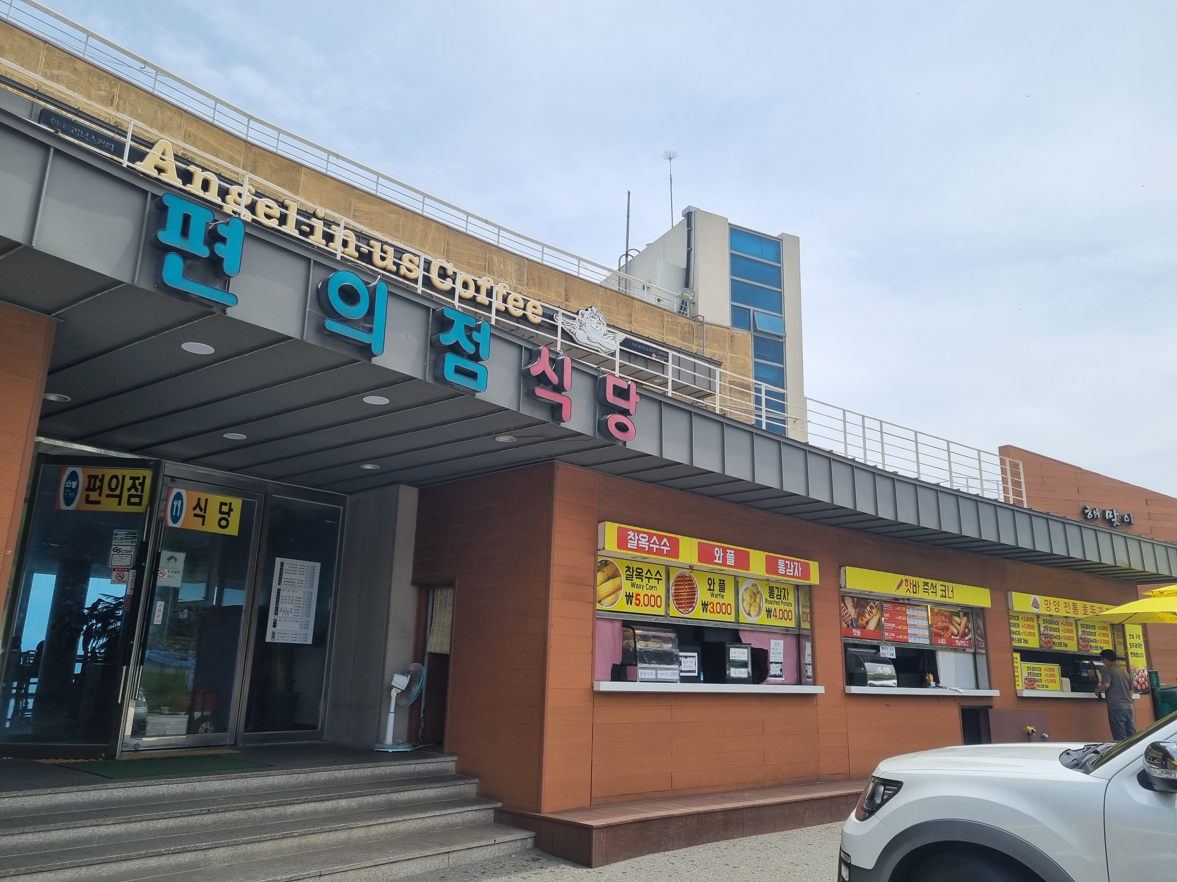 고속도로휴게소...가 아니어서 다소 서비스의 질은 떨어집니다~~ 하지만 뷰가 이리 멋진 휴게소는 다시 없을 듯해요 ㅎㅎ.상행하행 교차해서 만나는 곳이니.. 동해안7번국도 따라가실 때는 꼭