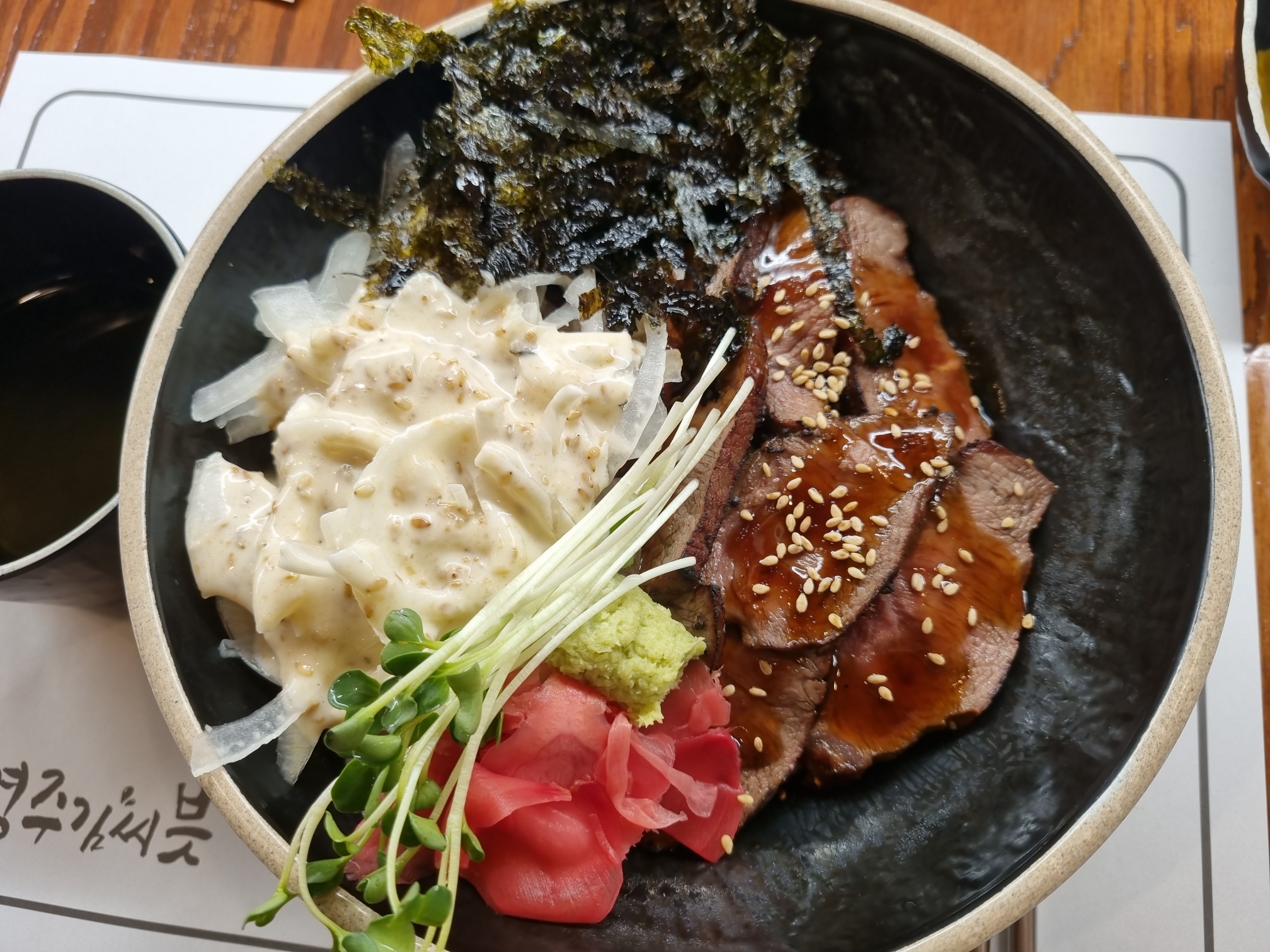 이 식당의 가장 인기메뉴가 스테이크 덮밥이에요~~10.000원인데 고기도 푸짐하고,소스 절여진 마요네즈와 무순의 조합도 훌륭해요