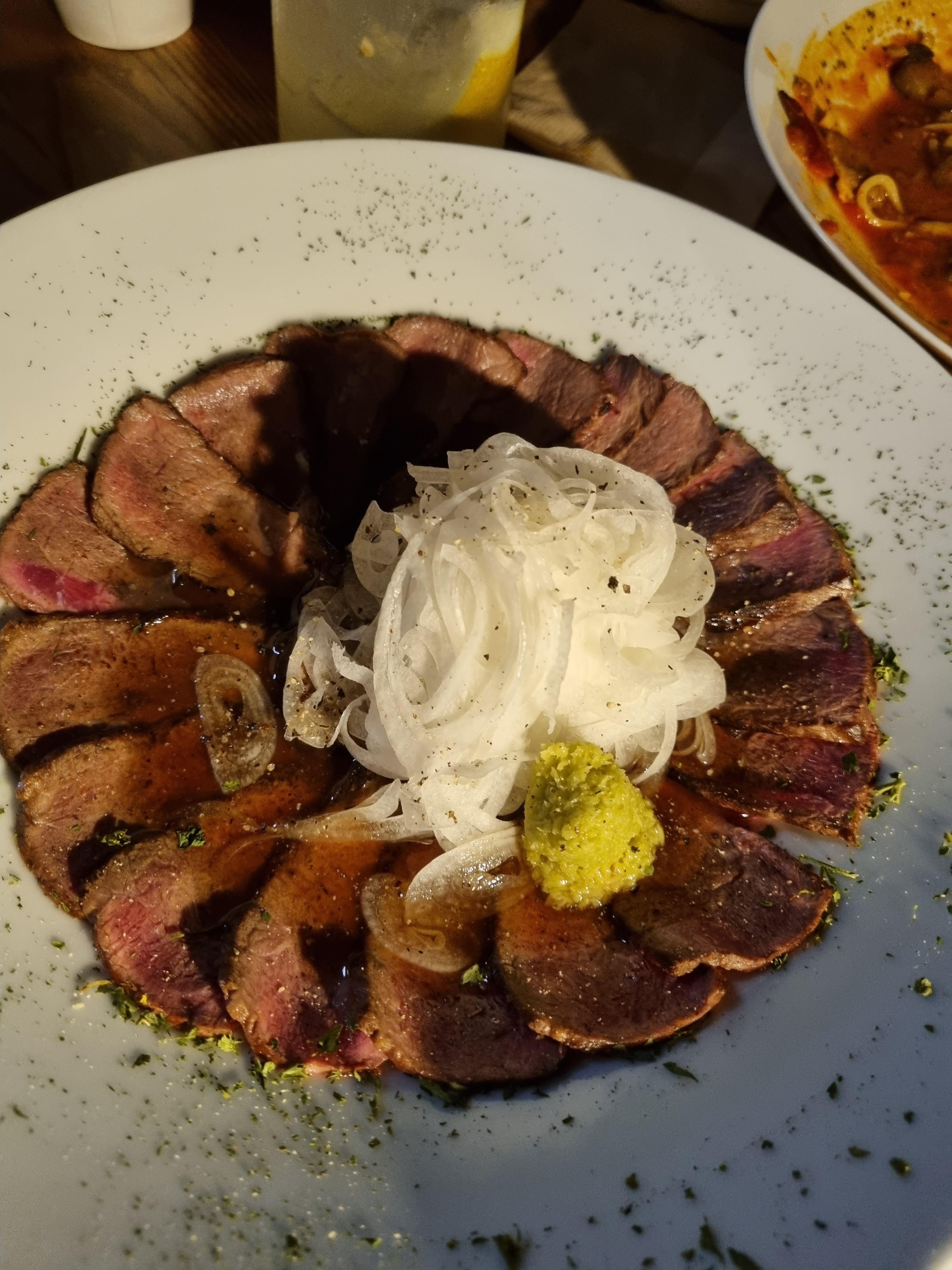 소고기 타다키~ 뚜컹 열어주시면 연기폴폴.스모크향이 확 퍼져요...음..냉채족발느낌?밑에 자작하게 와사비 베이스 국물도있어서..좀 독특한 타다키였어요