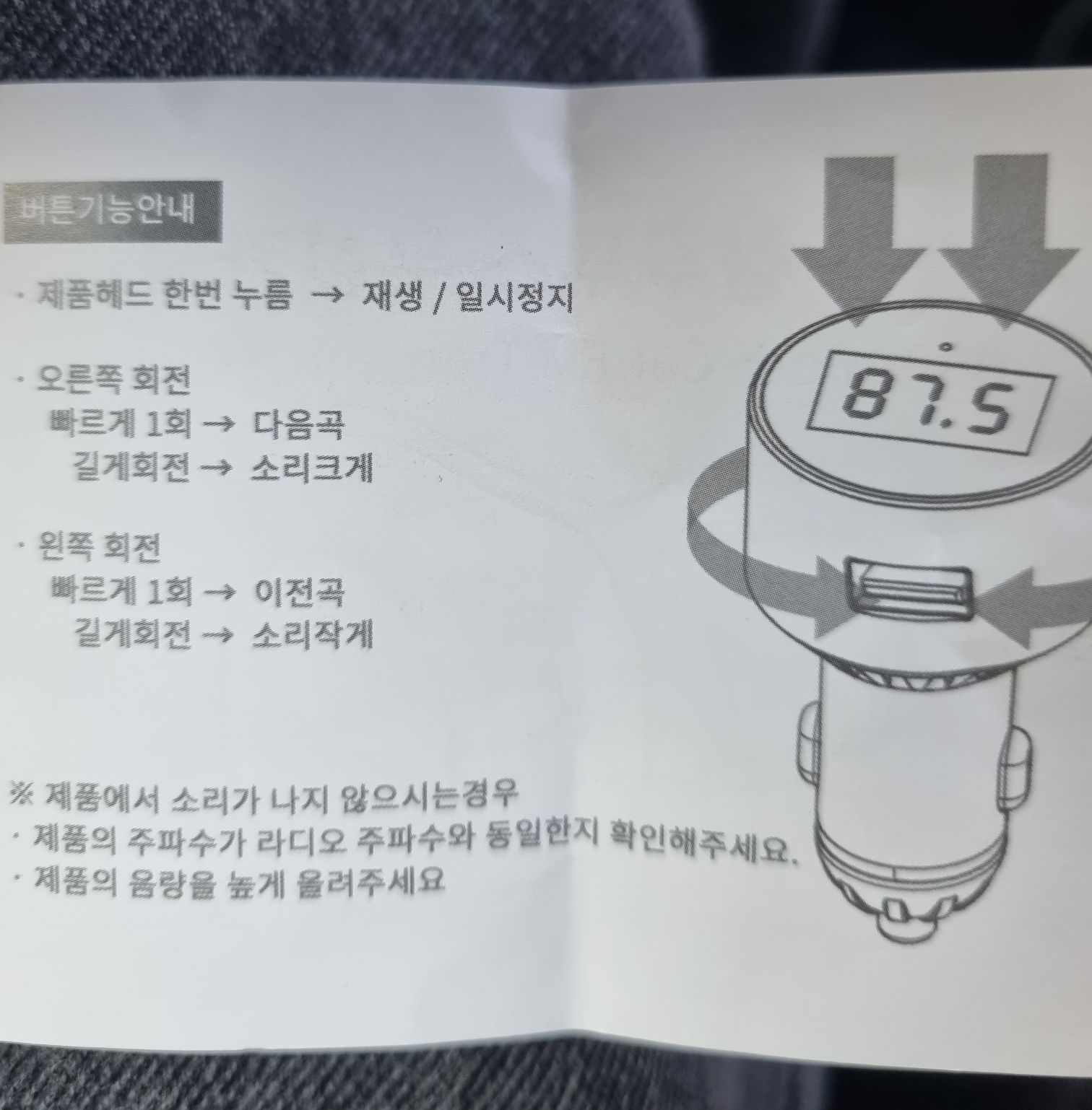 라디오 주파수를 맞춰야합니다~ 라디오 주파수를 차량과 기계에 일치하게 맞춰주고 휴대폰에서 블루투스 연결하면 끝납니다~~!!