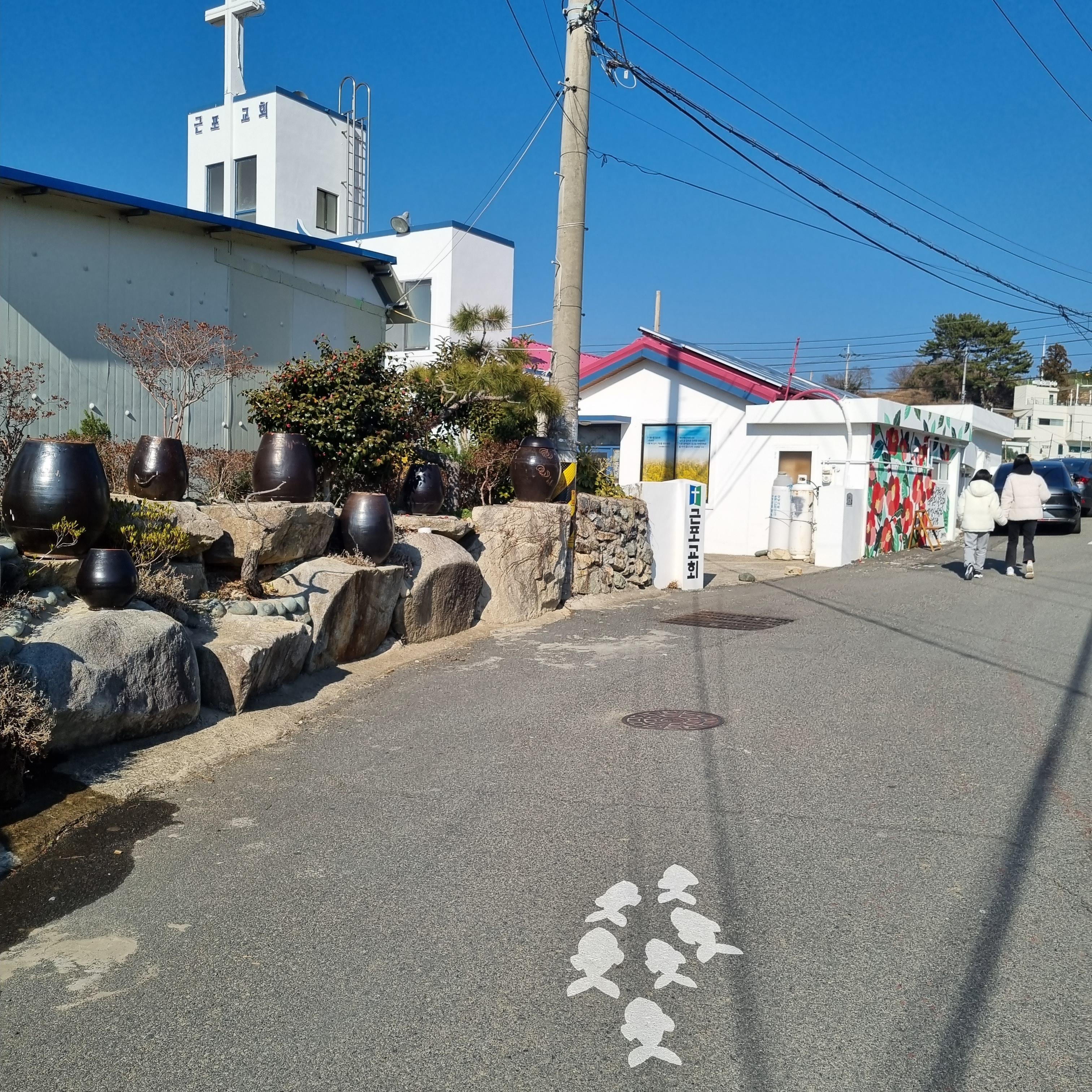 마을회관 앞에 주차를 하고 물고기를따라 걸어올라가요. 한 6.7분 정도 거리인데 볼 것도 있고