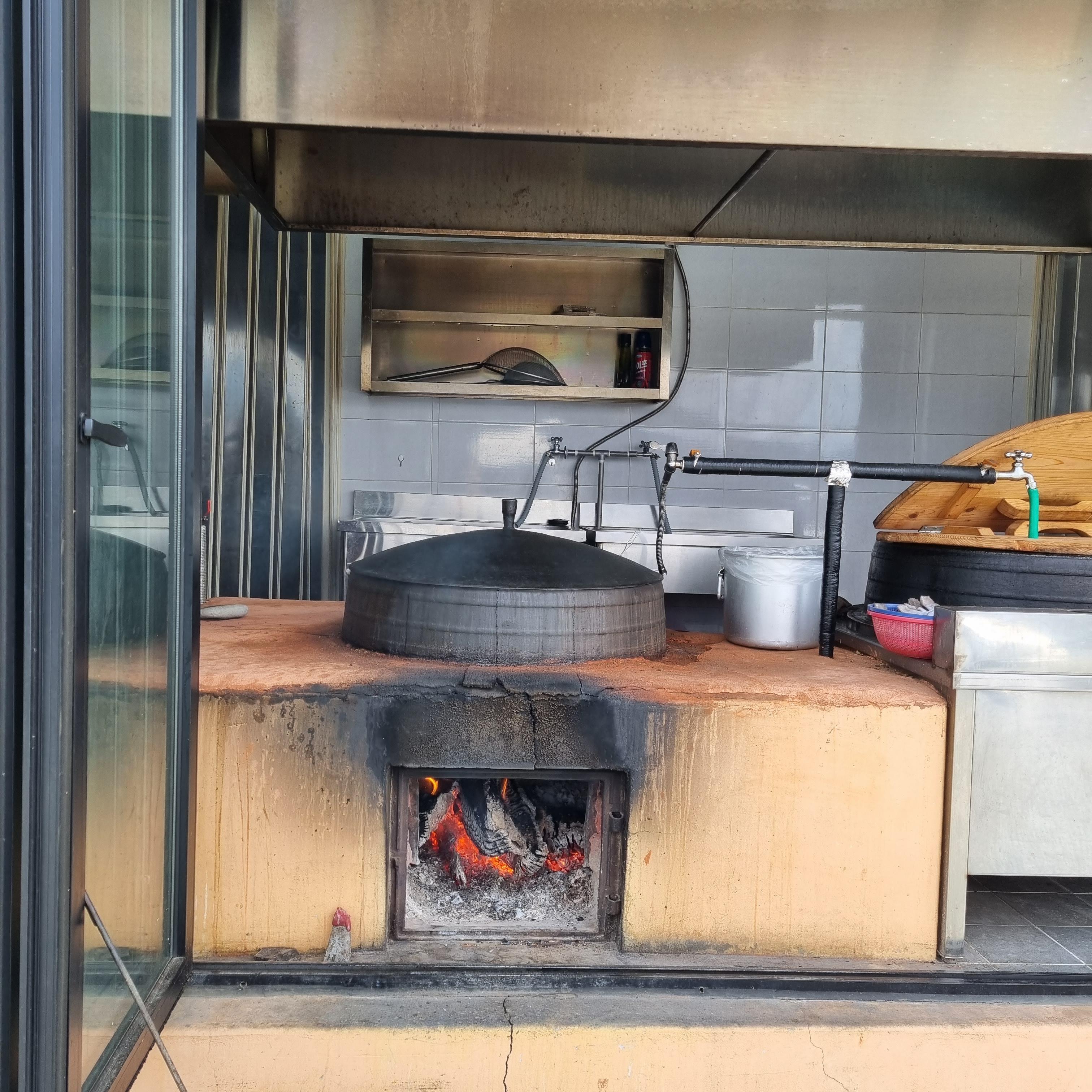장작 태워서 가마솥에 국이 막 끓고 있어요