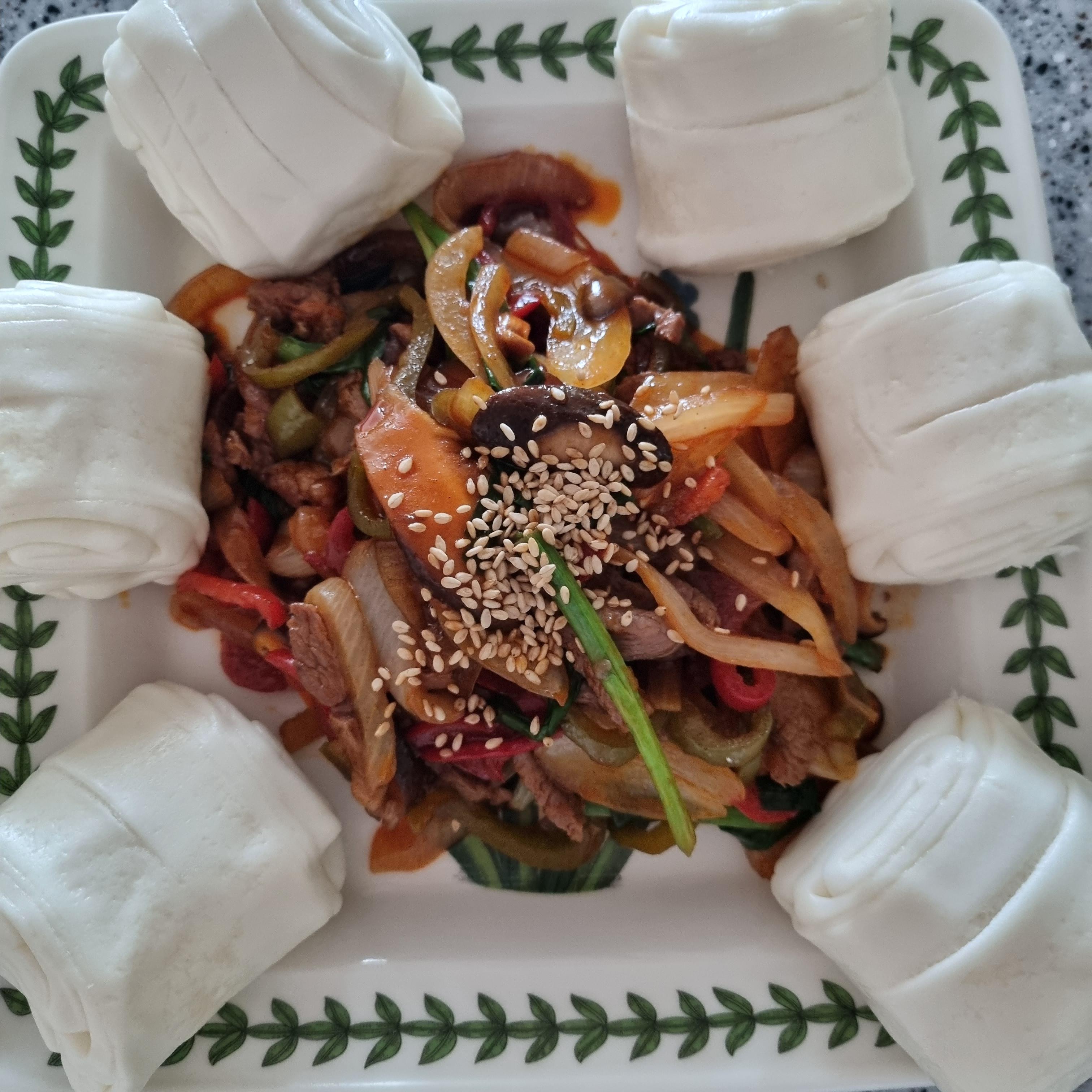 꽃빵,소고기, 채소, 굴소스, 고추기름,통깨소금이