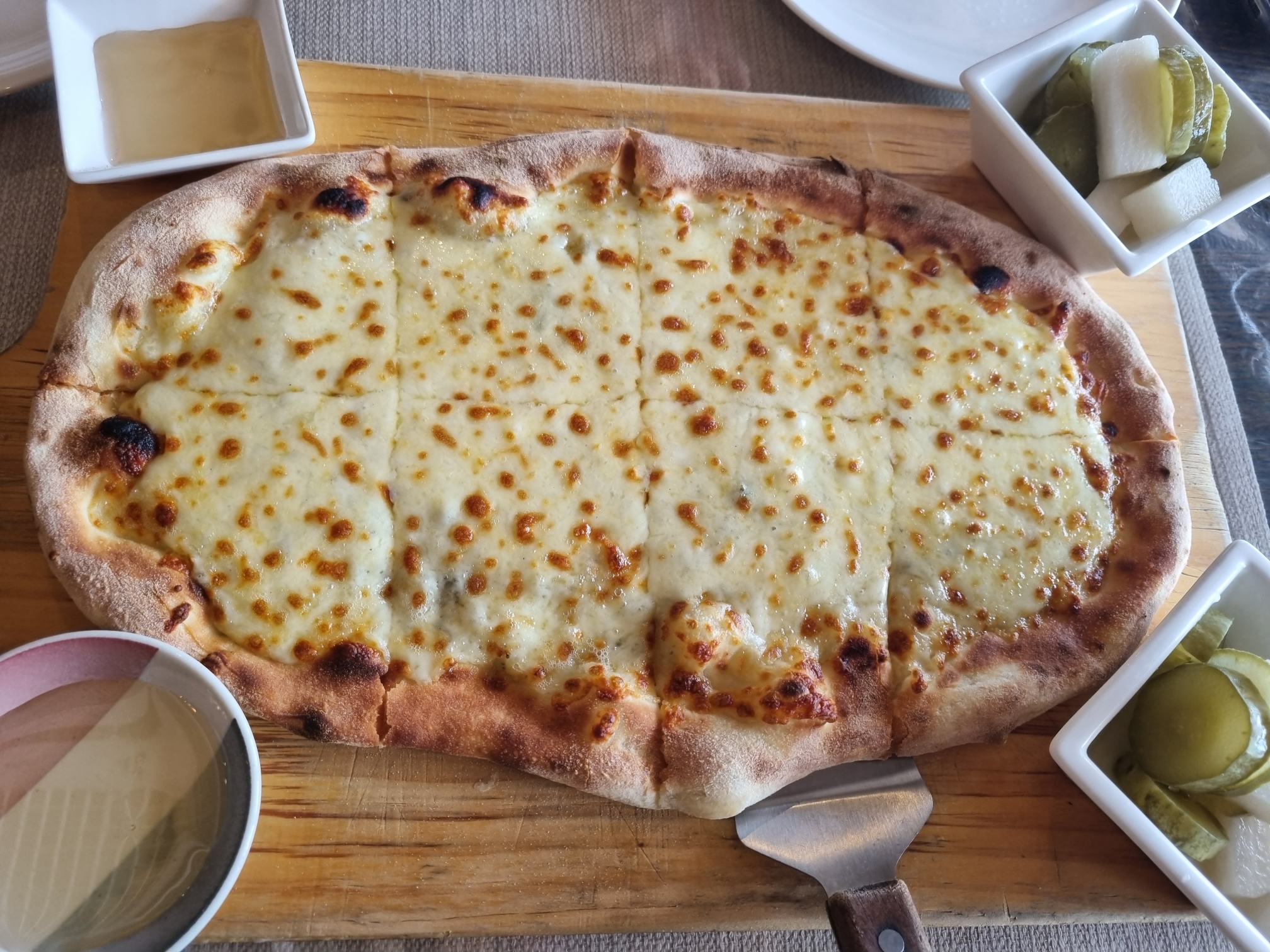 치즈 죽죽 늘어나는.. 도우가 앏은데 너무 담백한 고르곤 졸라부터~ 맛있어요 ㅎ