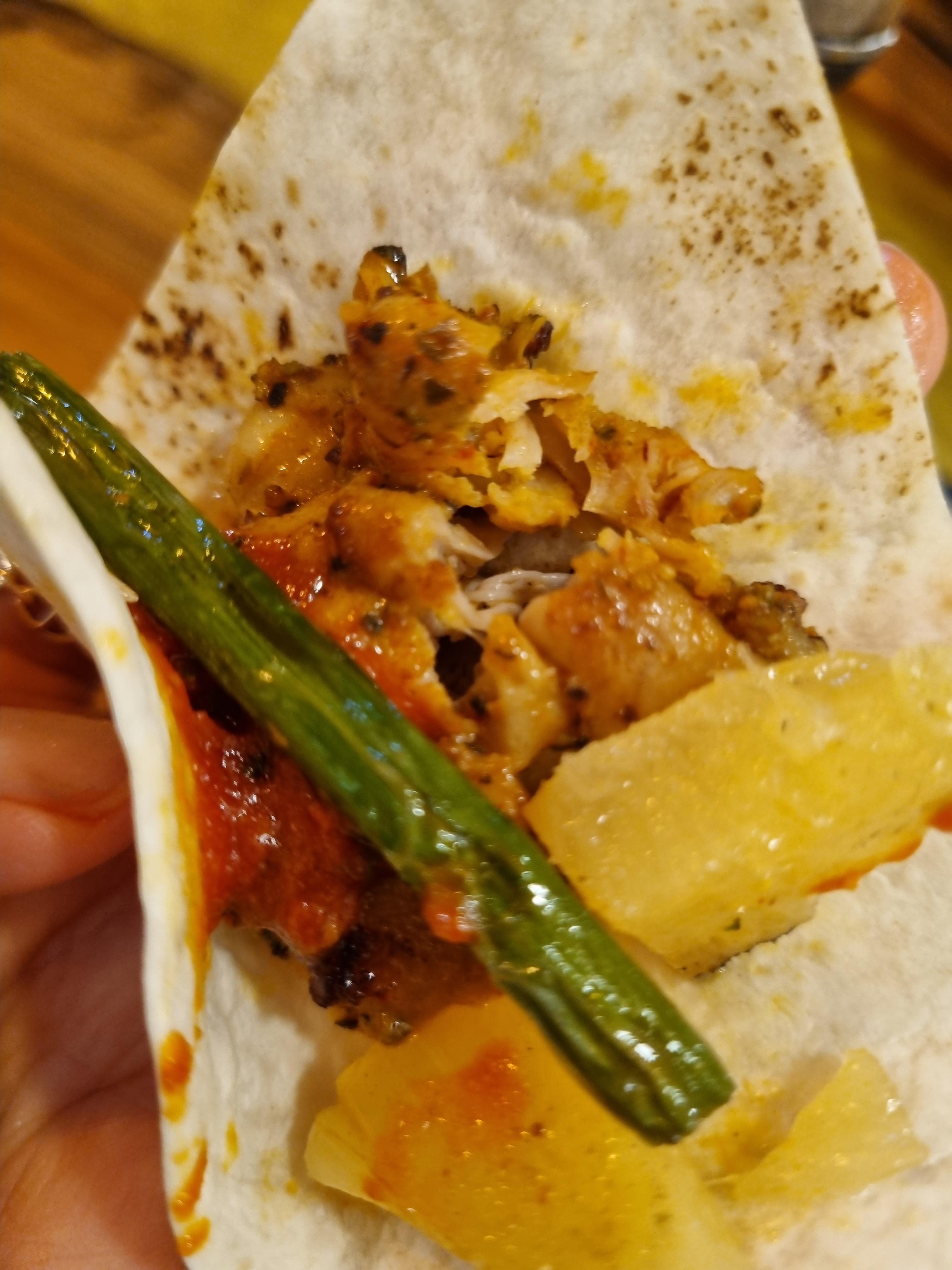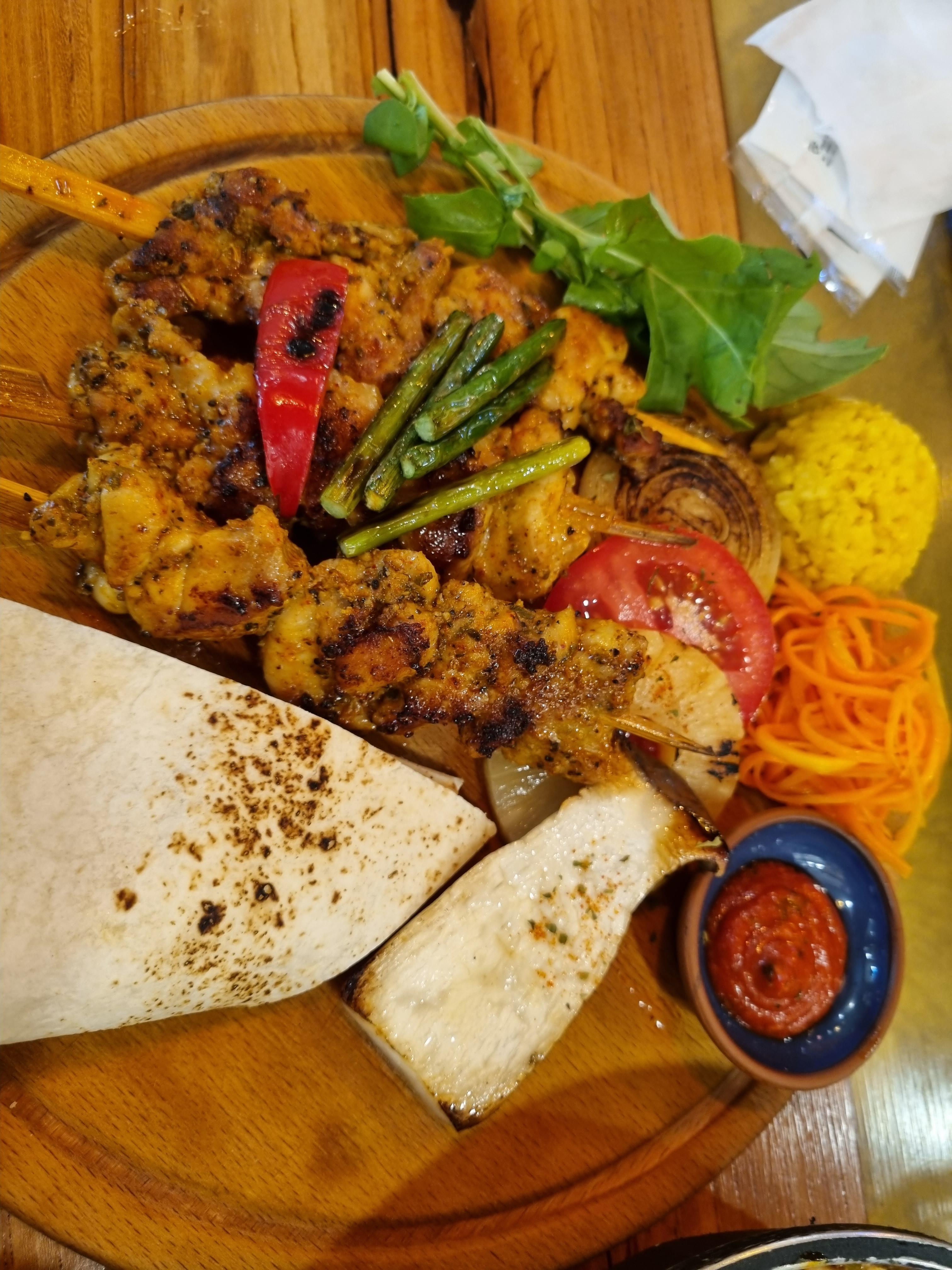 닭꼬치와 살사소스, 채소들을 난에 이것저것 싸먹는 음식이에요