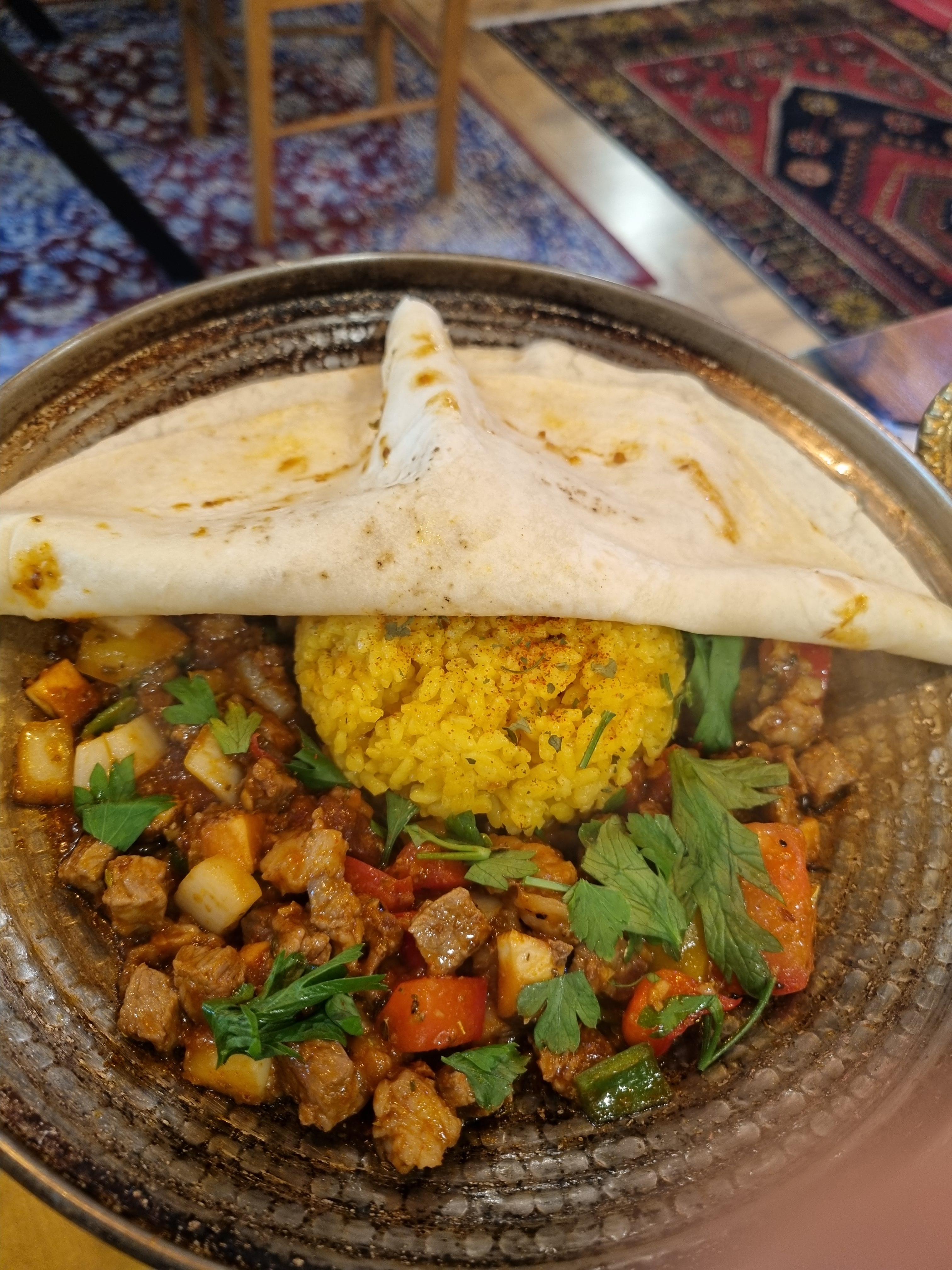 철판에 소고기볶음?같은게 들어있는데 약간 커리향도 나는것같고 덮혀있는 난에 밥과 싸먹기도하고 섞어서 먹어도 되요~