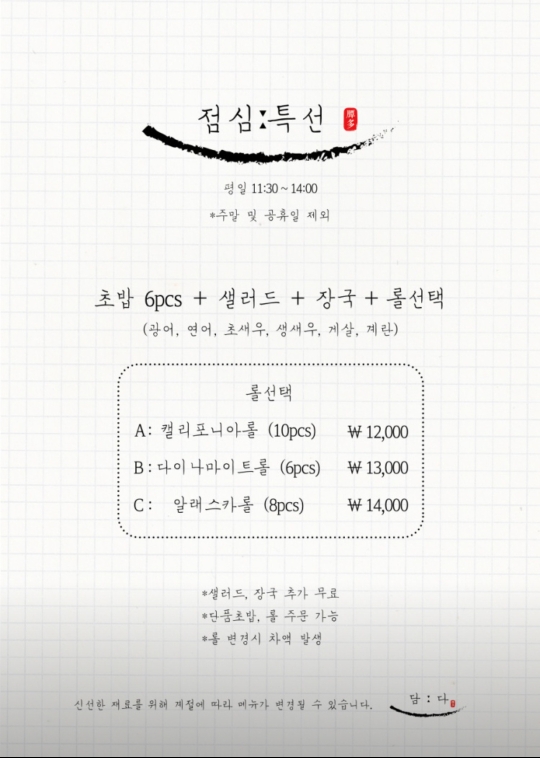 세트메뉴는 초밥7pcs와 롤을 선택할 수 있어요
