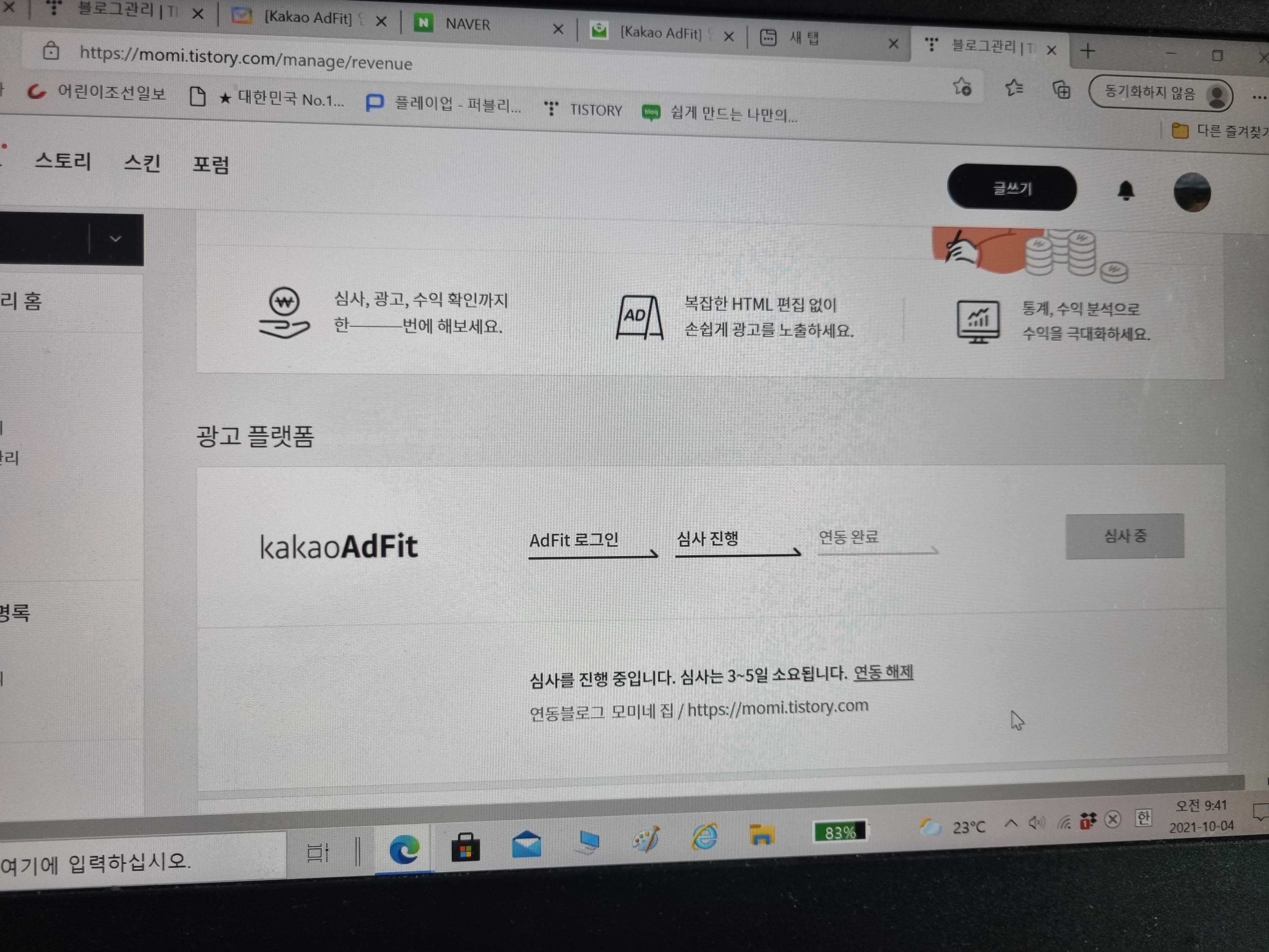 드디어~~애드핏 신청 자격이 주어졌어요^^저같은 사람에겐 수익이 얼마 안 되겠지만, 제겐 의미있는 일이에요