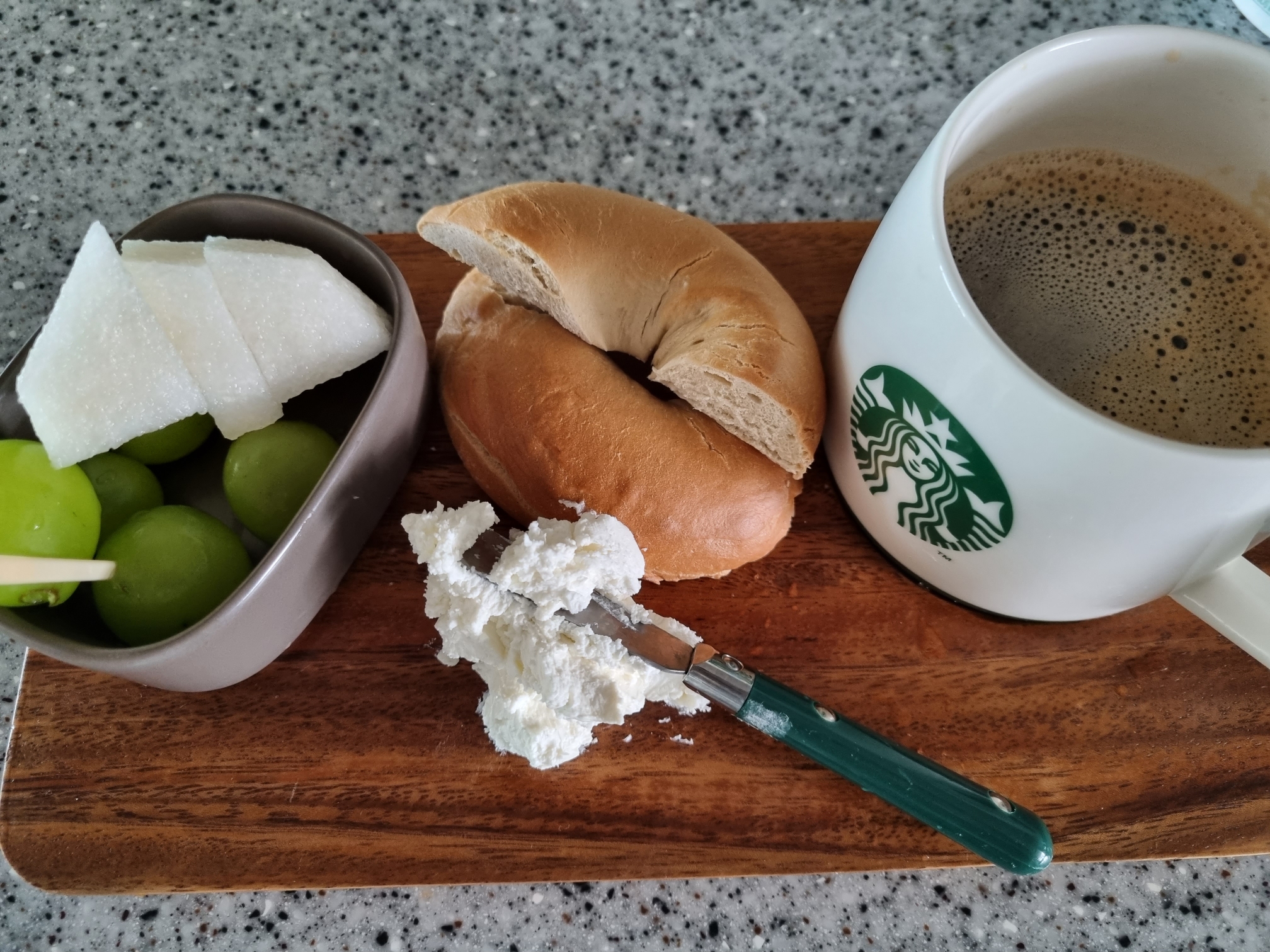 아침은 PICK A BAGLE 반 쪽과 배, 샤인 머스켓, 커피로 해결했어요~~