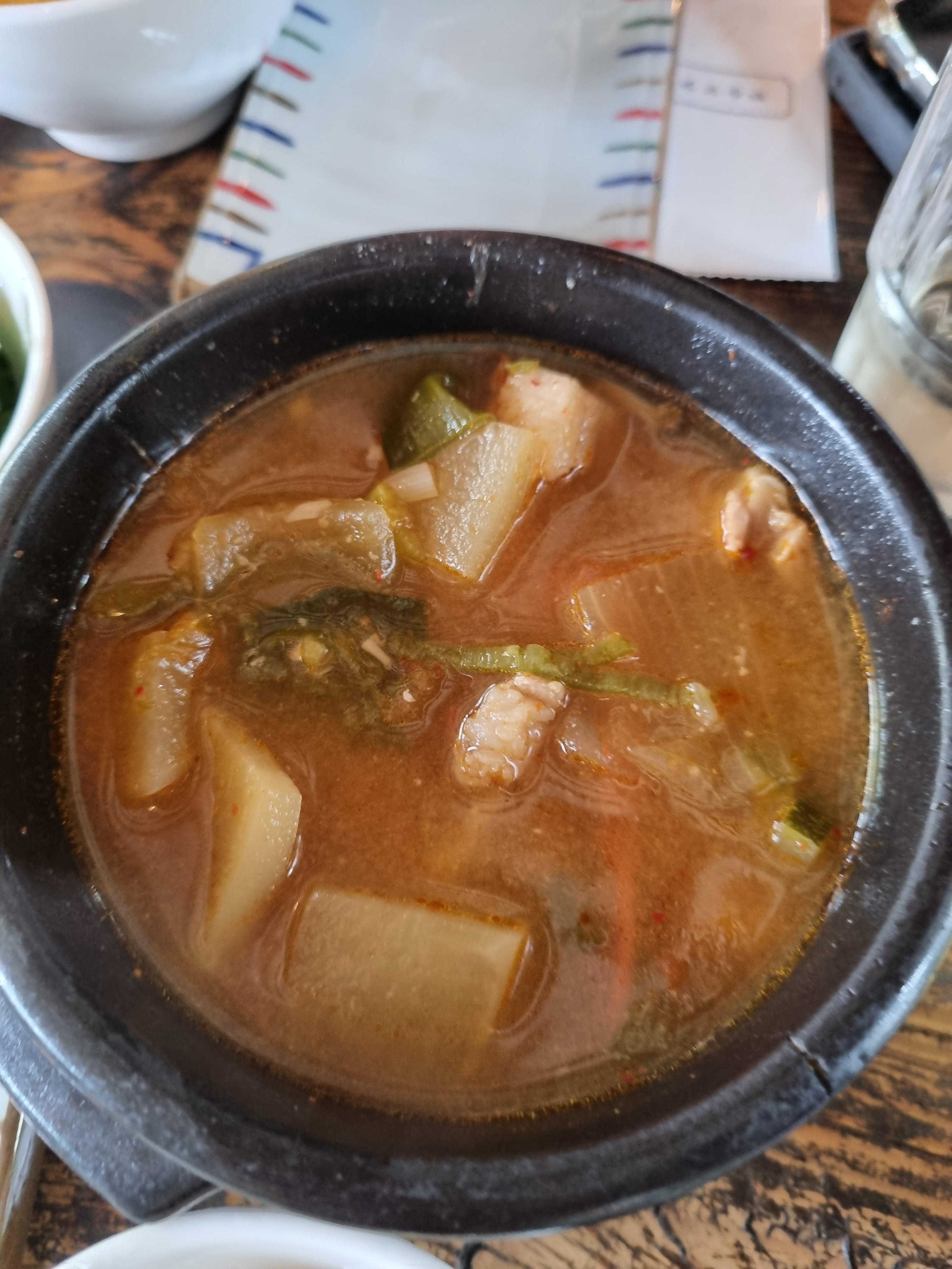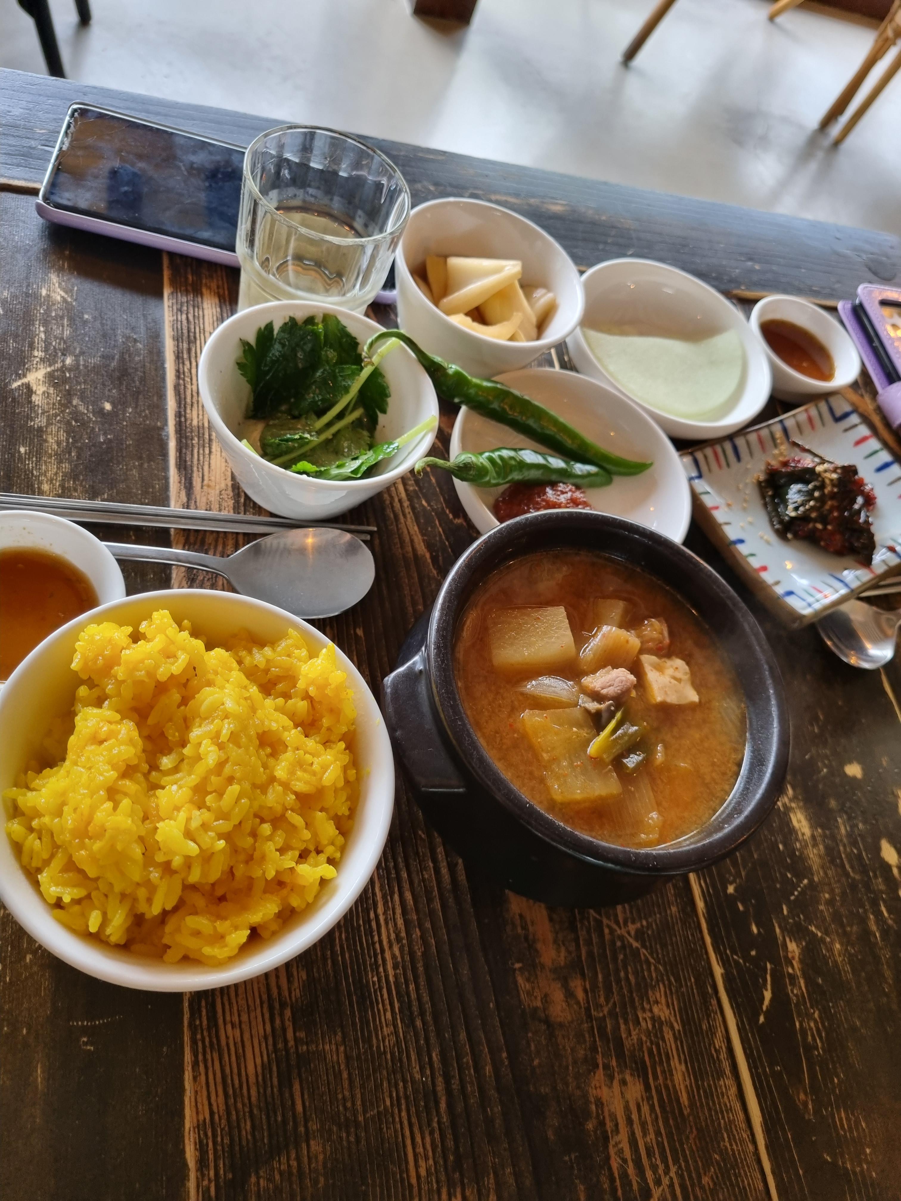 밥 양이 웬만한 집 두 공기택은 됩니다. 강황 밥인데, 특별한 향. 맛은 없어요. 색만 노란색. 양은 정말 많아요. 된장은 하나에 2000원인데요 작은 뚝배기에 담아내 주시는데 안에 고기도 들어있네요.