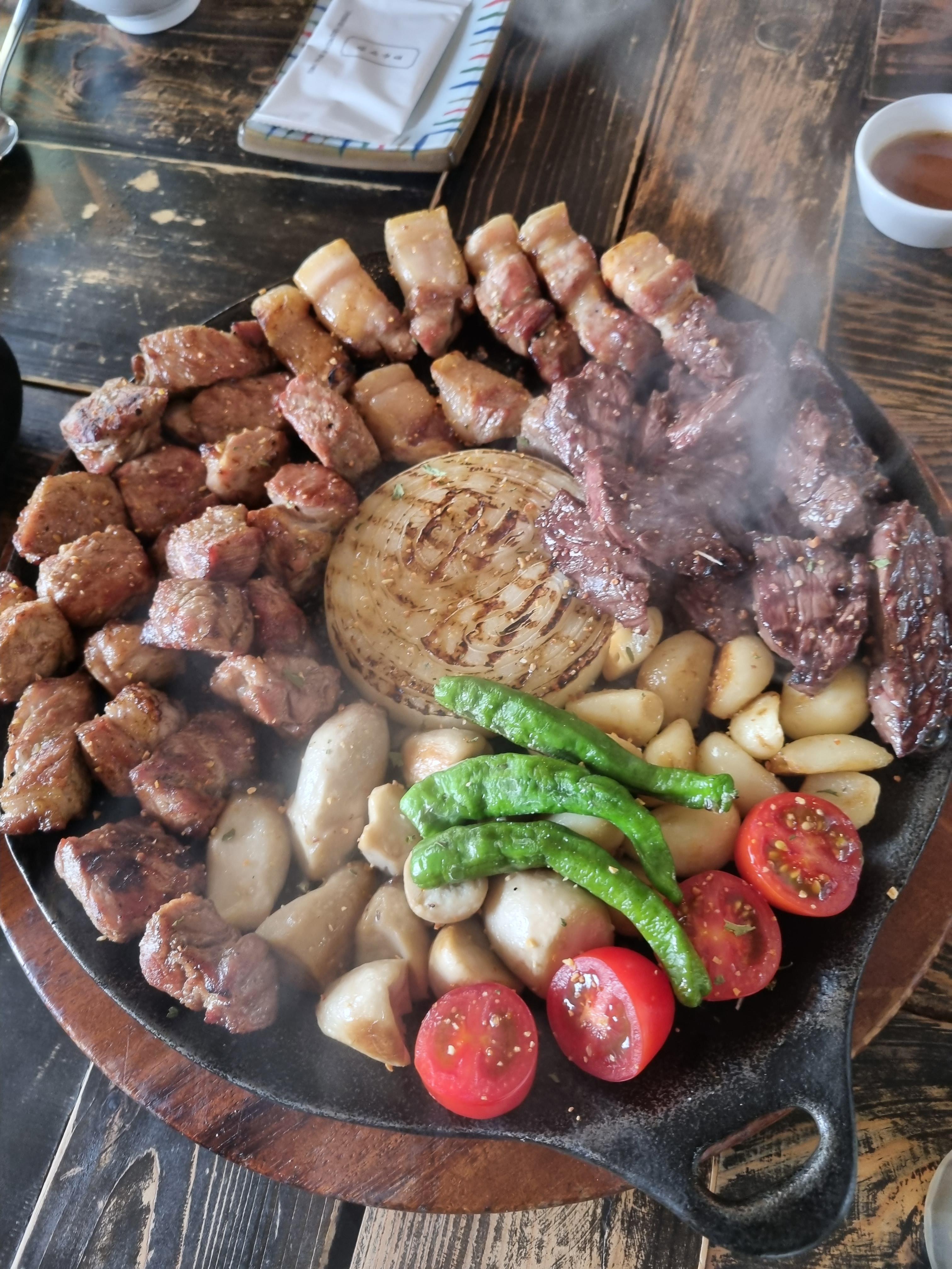 고기, 양파, 버섯, 마늘, 방울토마토, 고추 좋아하는 거 다 모여있어요. 음, 쌈채소나 파채 무침 같은 게 있다면 더 좋을 거 같은데 그런 거는 없어요~~