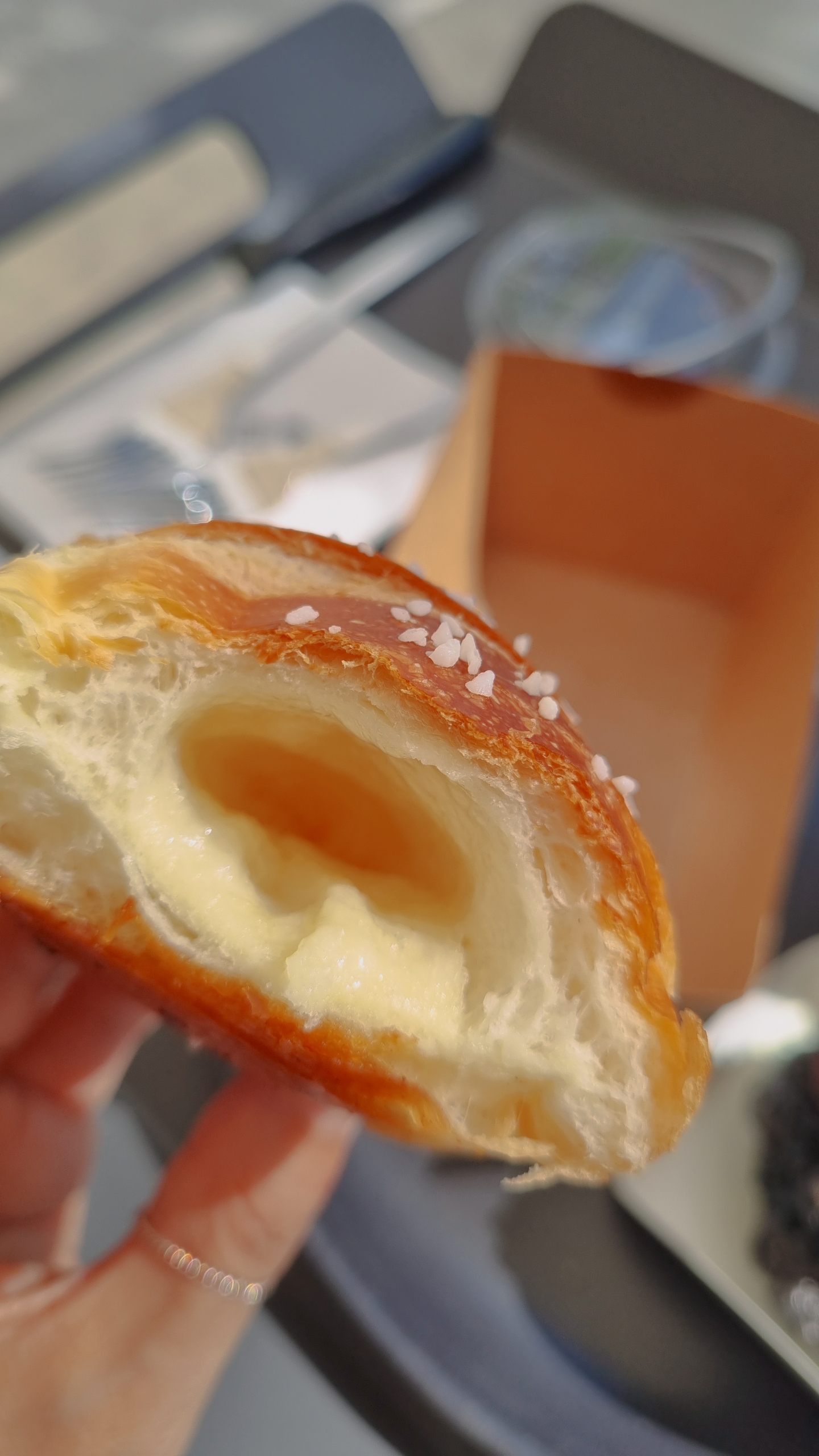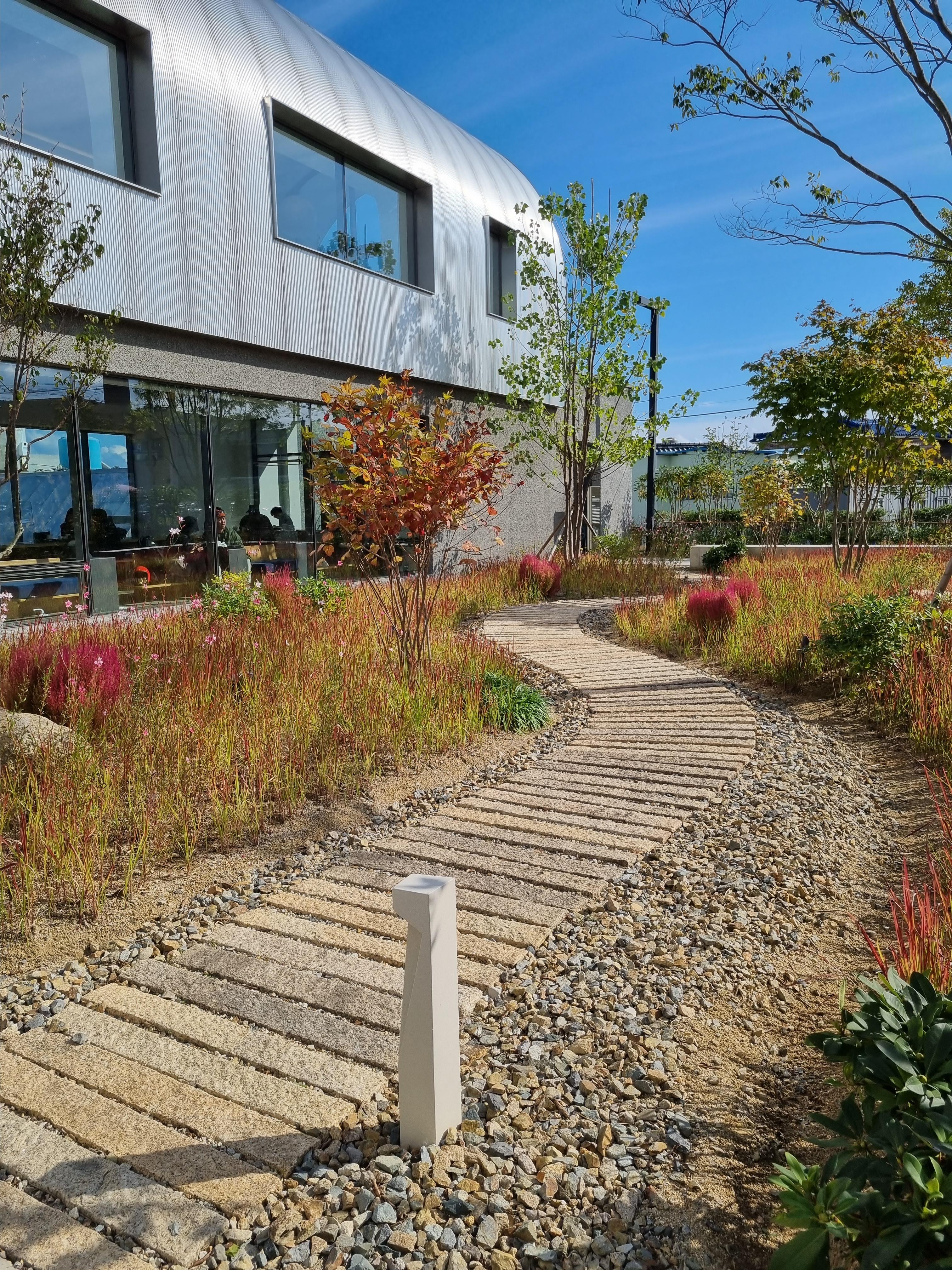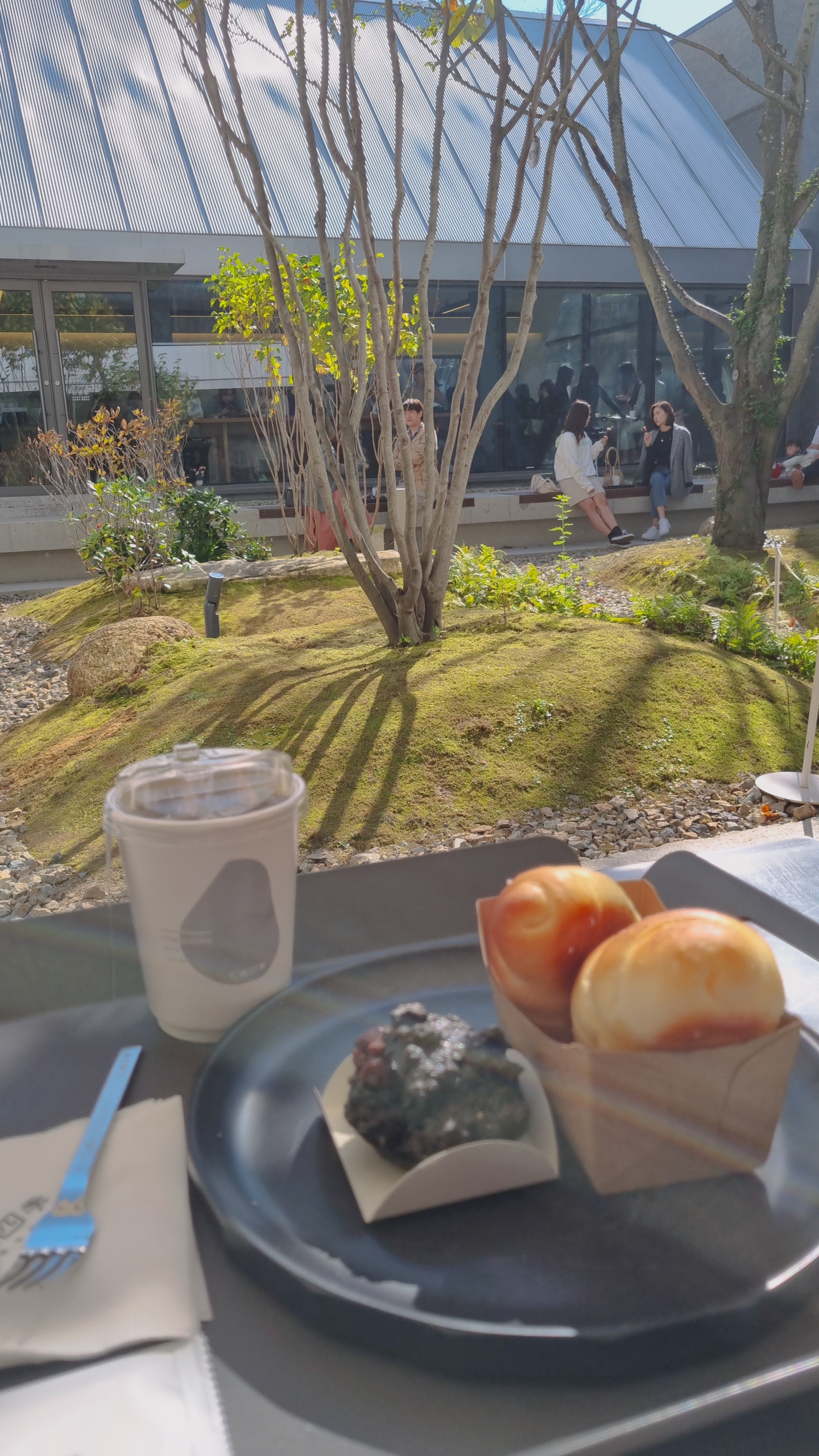 중간 정원 같은 곳에서, 이 집에서 유명한 소금빵과 칠암돌만주를 먹었어요. 소금빵 두 개-3200원. 칠암돌만주- 2000원. 아메리카노 5700원.