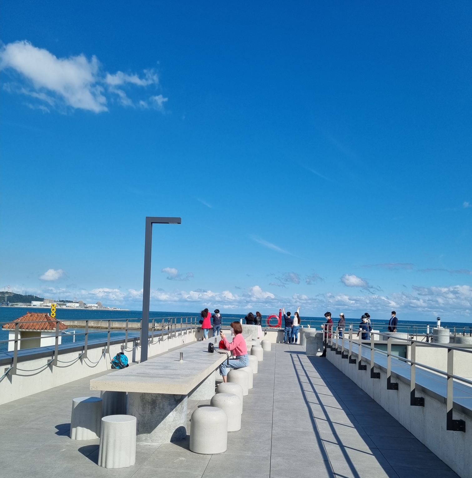 3층 루프탑에 쫙 뻗은 대리석 테이블과 좌석, 펼쳐진 바다 인상적이었어요. 다른 대부분의 자리는 사람들이 꽉꽉 들어차 있어서 촬영이 불가할 정도로 사람이 많더라고요.